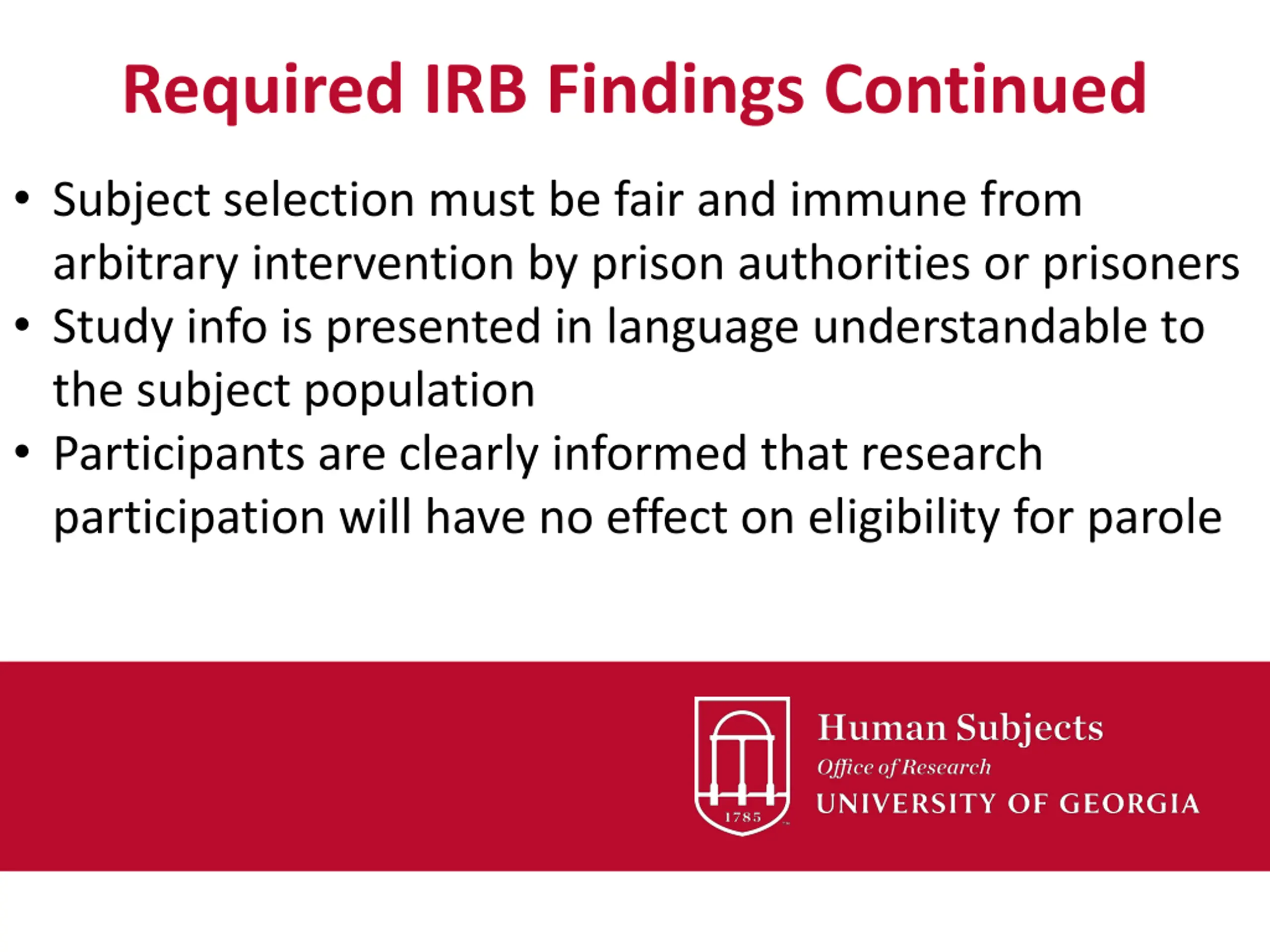 Required IRB Findings Continued Subject selection must be fair and immune from arbitrary intervention by prison authorities or prisoners Study info is presented in language understandable to the subject population Participants are clearly informed that research participation will have no effect on eligibility for parole