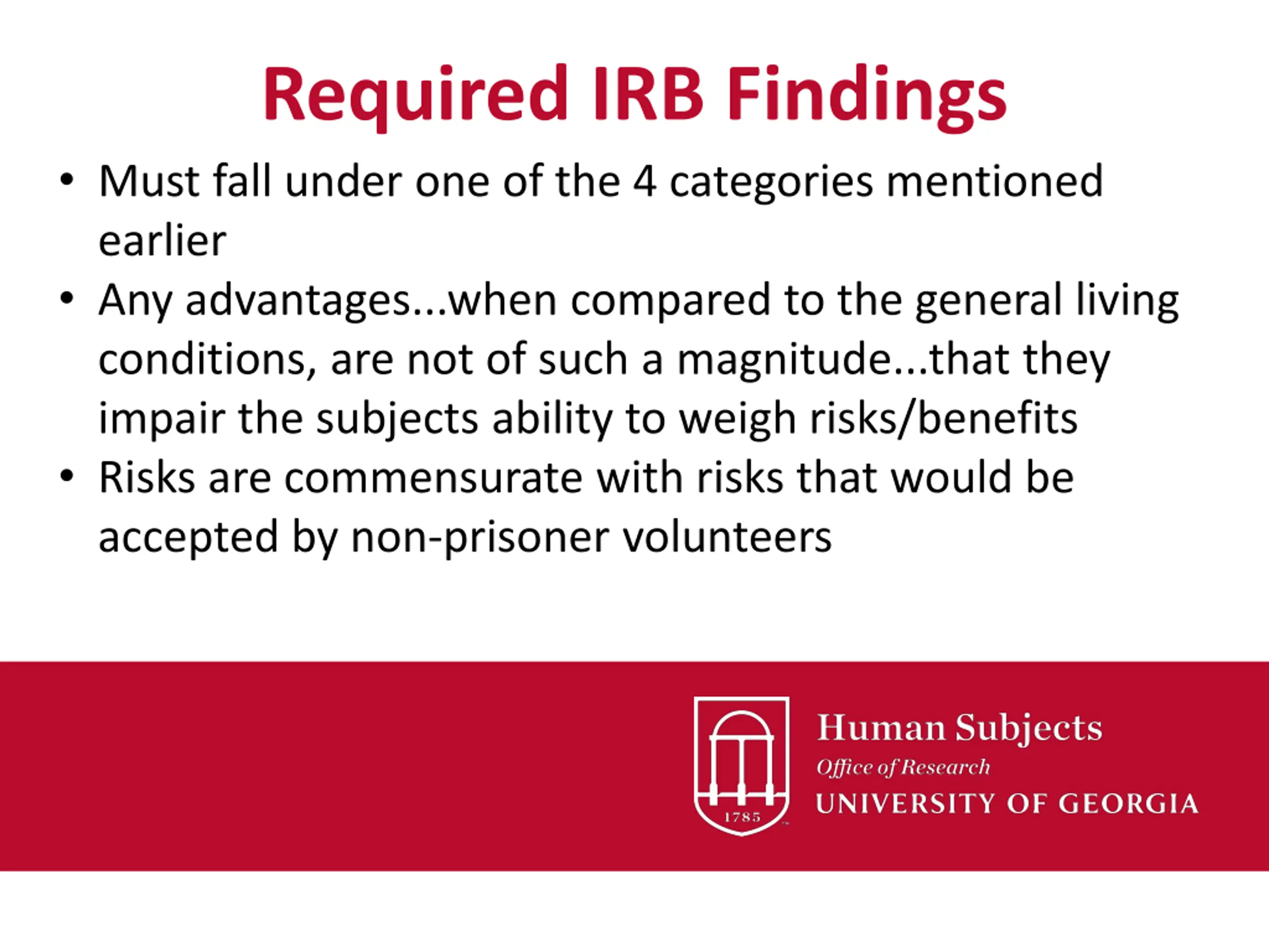 Required IRB Findings Must fall under one of the 4 categories mentioned earlier Any advantages...when compared to the general living conditions, are not of such a magnitude...that they impair the subjects ability to weigh risks/benefits Risks are commensurate with risks that would be accepted by non-prisoner volunteers