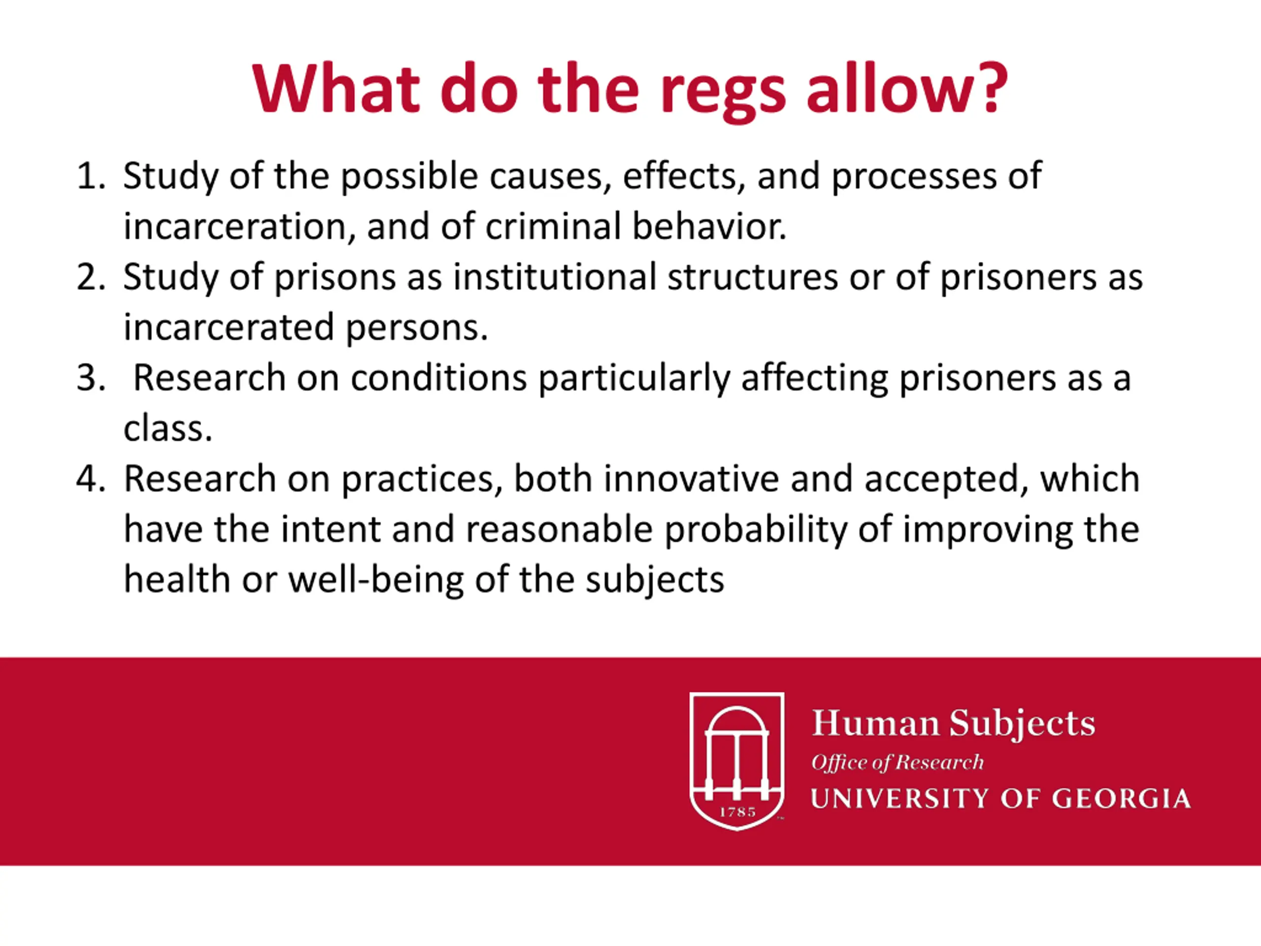 What do the regs allow? 1. Study of the possible causes, effects, and processes of incarceration, and of criminal behavior. 2. Study of prisons as institutional structures or of prisoners as incarcerated persons. 3. Research on conditions particularly affecting prisoners as a class. 4. Research on practices, both innovative and accepted, which have the intent and reasonable probability of improving the health or well-being of the subjects