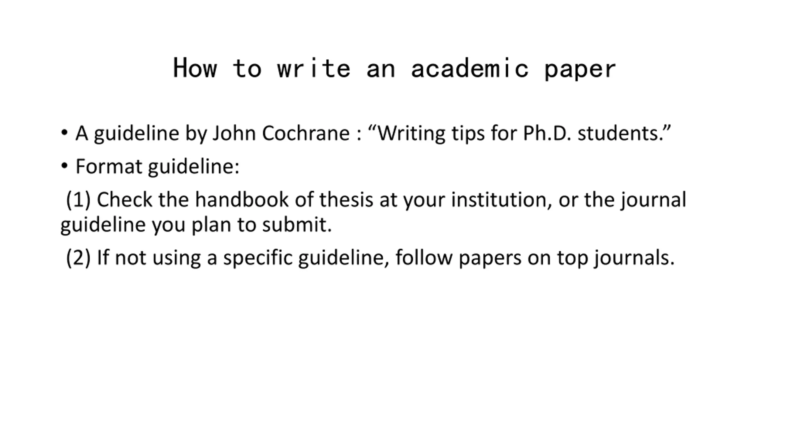 How to write an academic paper A guideline by John Cochrane : Writing tips for Ph.D. students. Format guideline: (1) Check the handbook of thesis at your institution, or the journal guideline you plan to submit. (2) If not using a specific guideline, follow papers on top journals.