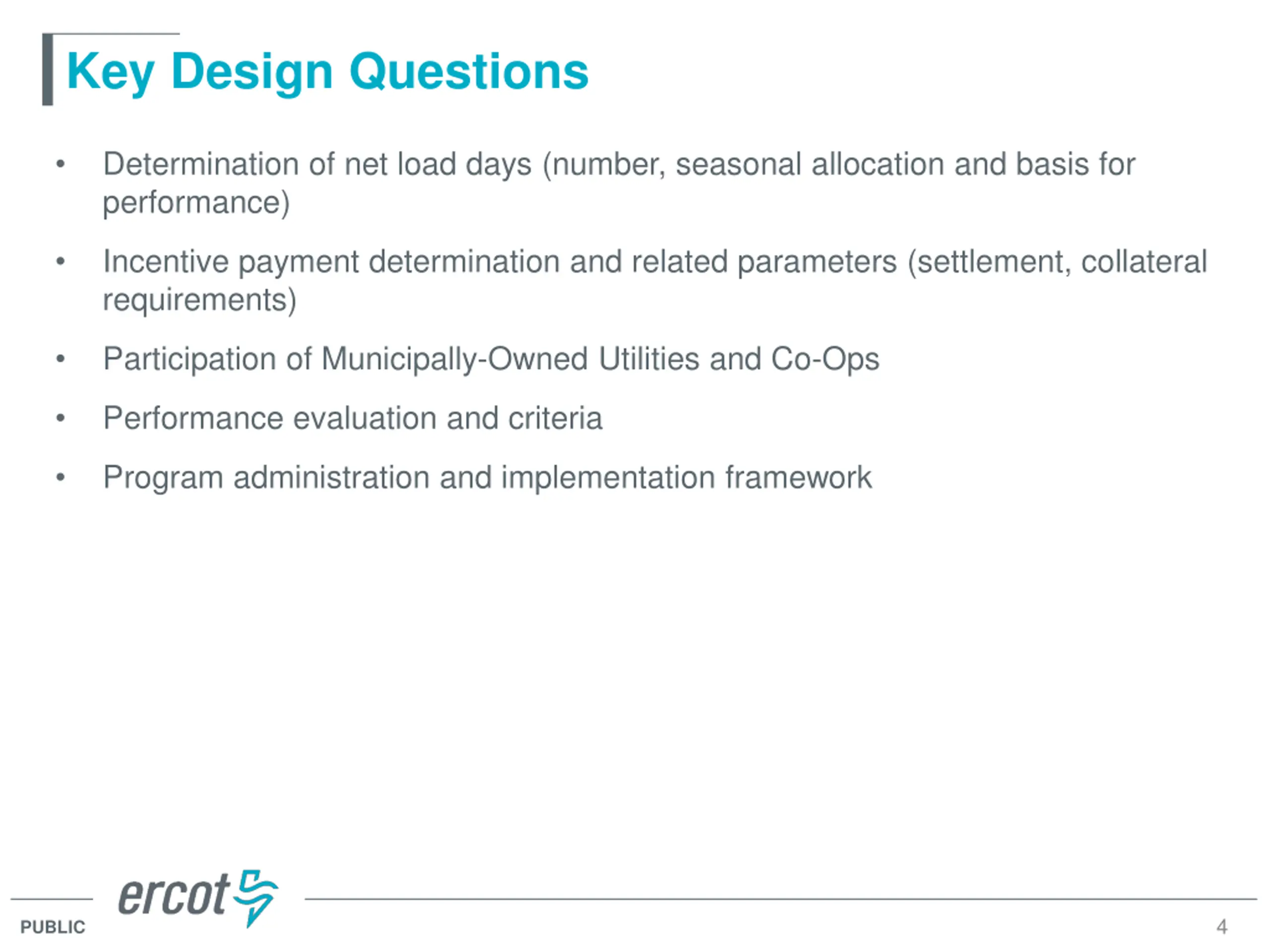 Key Design Questions Determination of net load days (number, seasonal allocation and basis for performance) Incentive payment determination and related parameters (settlement, collateral requirements) Participation of Municipally-Owned Utilities and Co-Ops Performance evaluation and criteria Program administration and implementation framework 4 PUBLIC