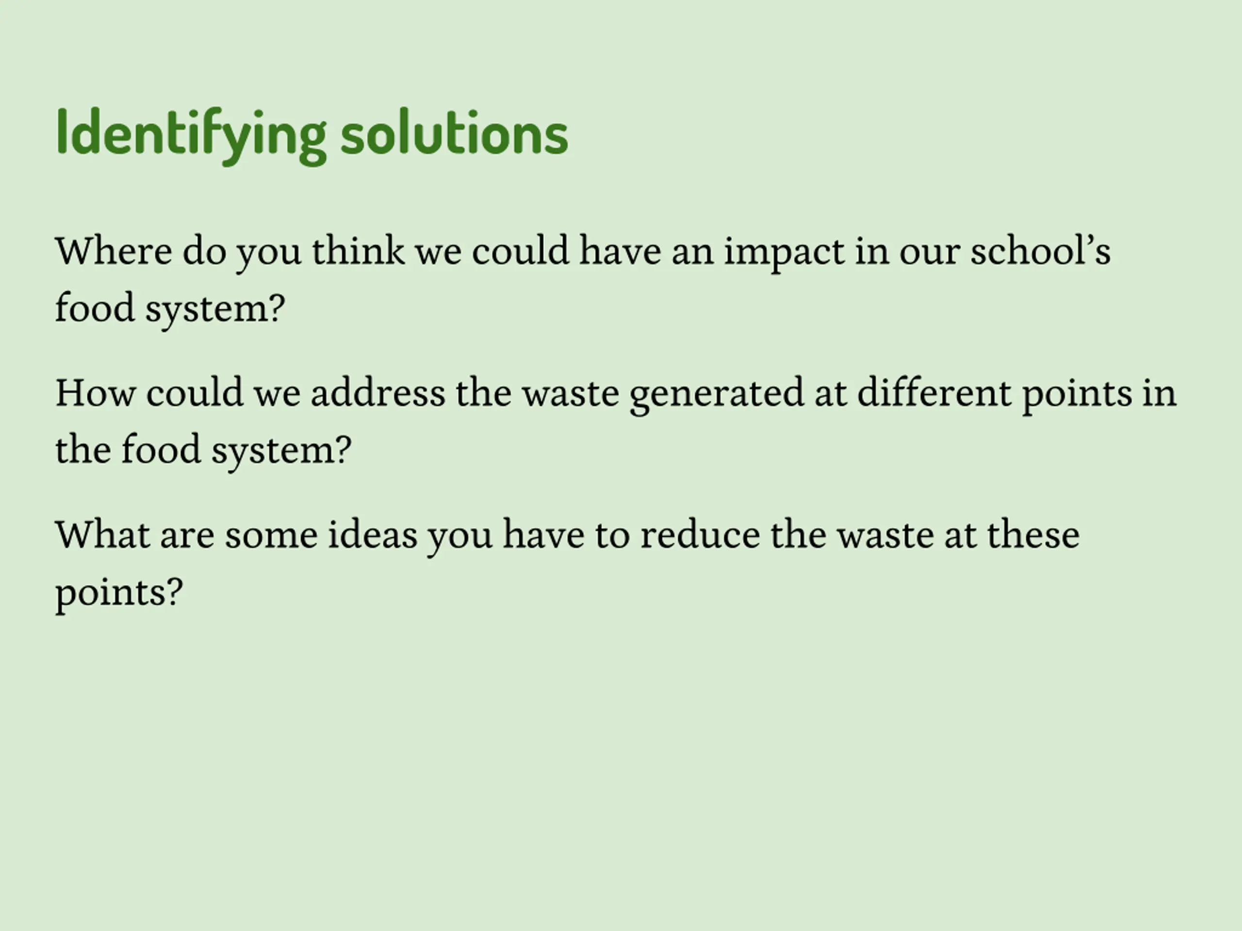 Identifying solutions Where do you think we could have an impact in our school s food system? How could we address the waste generated at different points in the food system? What are some ideas you have to reduce the waste at these points?