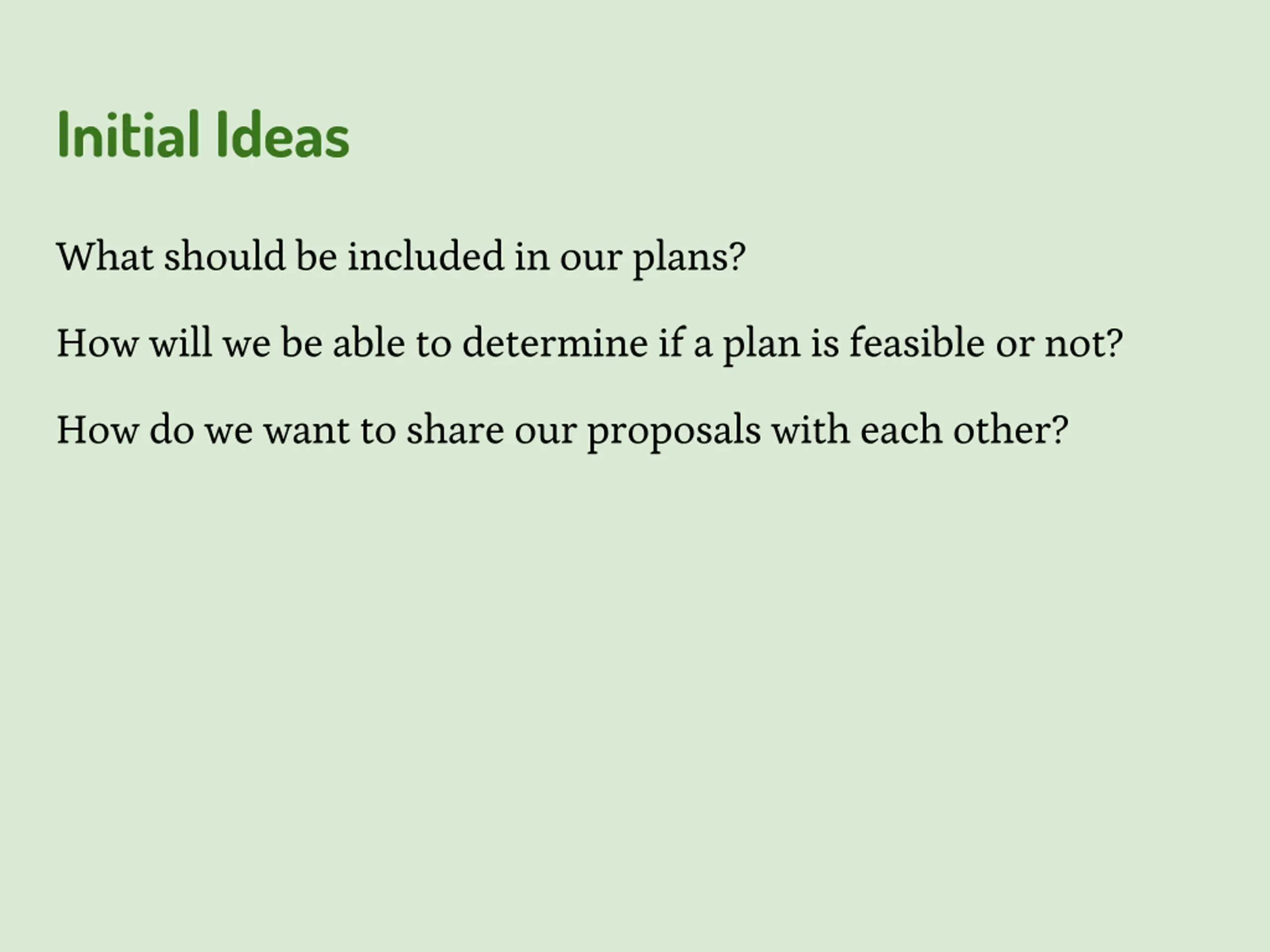 Initial Ideas What should be included in our plans? How will we be able to determine if a plan is feasible or not? How do we want to share our proposals with each other?