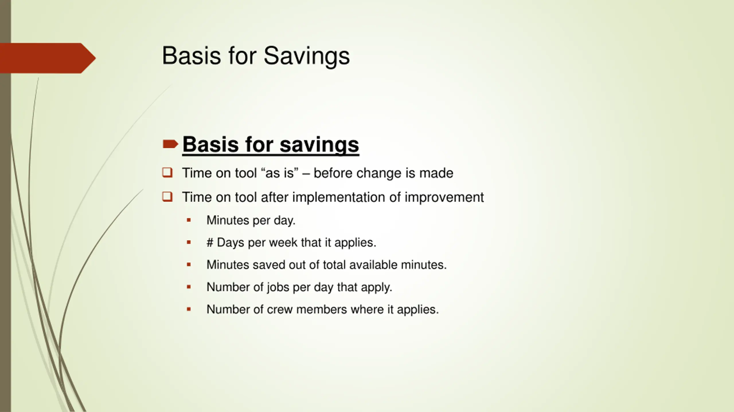 Basis for Savings Basis for savings Time on tool as is before change is made Time on tool after implementation of improvement Minutes per day. # Days per week that it applies. Minutes saved out of total available minutes. Number of jobs per day that apply. Number of crew members where it applies.