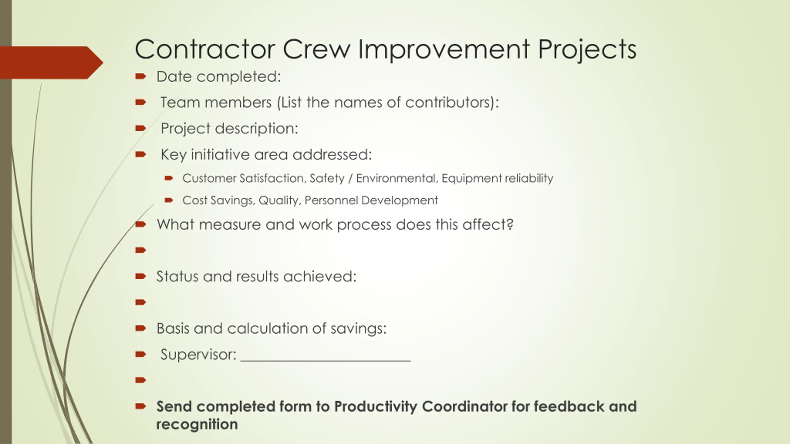 Contractor Crew Improvement Projects Date completed: Team members (List the names of contributors): Project description: Key initiative area addressed: Customer Satisfaction, Safety / Environmental, Equipment reliability Cost Savings, Quality, Personnel Development What measure and work process does this affect? Status and results achieved: Basis and calculation of savings: Supervisor: _______________________ Send completed form to Productivity Coordinator for feedback and recognition