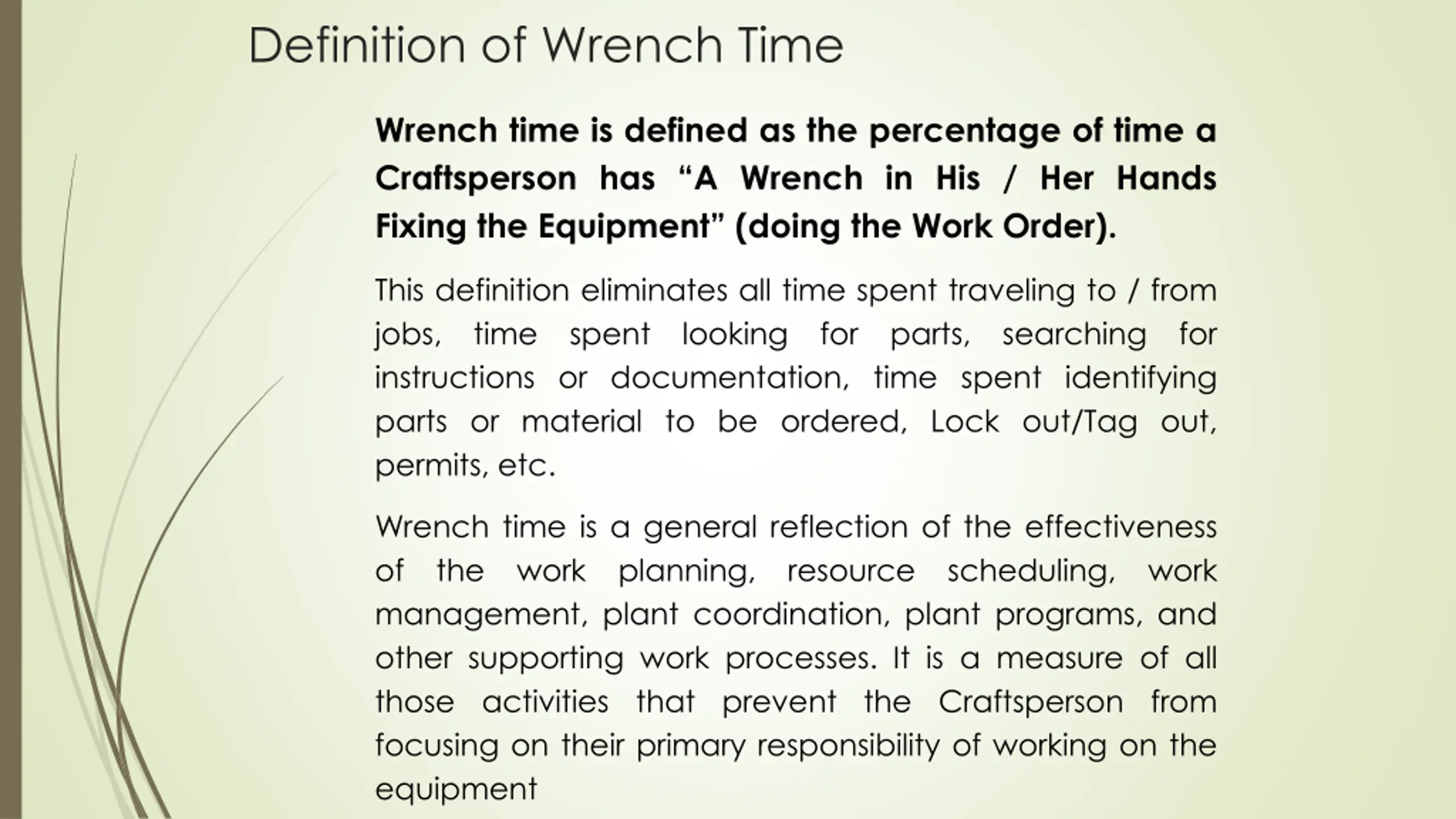 Definition of Wrench Time Wrench time is defined as the percentage of time a Craftsperson has A Wrench in His / Her Hands Fixing the Equipment (doing the Work Order). This definition eliminates all time spent traveling to / from jobs, time spent looking for parts, searching for instructions or documentation, time spent identifying parts or material to be ordered, Lock out/Tag out, permits, etc. Wrench time is a general reflection of the effectiveness of the work planning, resource scheduling, work management, plant coordination, plant programs, and other supporting work processes. It is a measure of all those activities that prevent the Craftsperson from focusing on their primary responsibility of working on the equipment