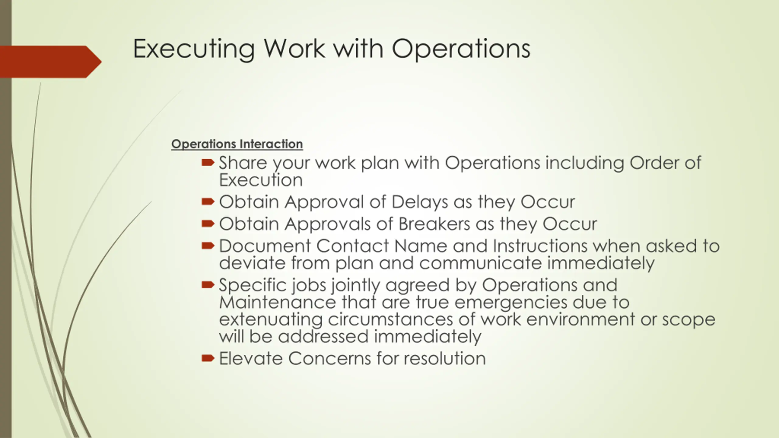 Executing Work with Operations Operations Interaction Share your work plan with Operations including Order of Execution Obtain Approval of Delays as they Occur Obtain Approvals of Breakers as they Occur Document Contact Name and Instructions when asked to deviate from plan and communicate immediately Specific jobs jointly agreed by Operations and Maintenance that are true emergencies due to extenuating circumstances of work environment or scope will be addressed immediately Elevate Concerns for resolution