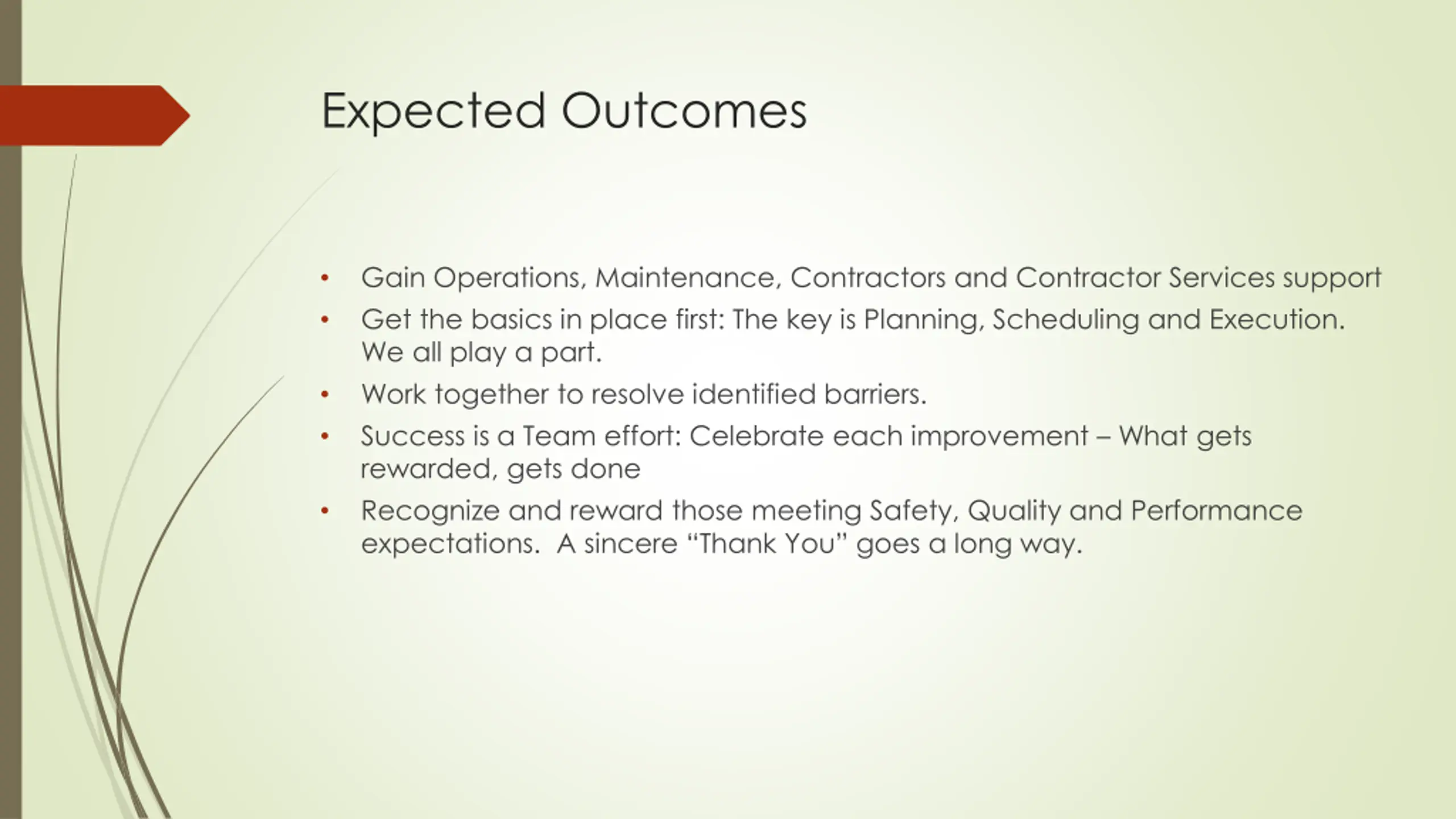 Expected Outcomes Gain Operations, Maintenance, Contractors and Contractor Services support Get the basics in place first: The key is Planning, Scheduling and Execution. We all play a part. Work together to resolve identified barriers. Success is a Team effort: Celebrate each improvement What gets rewarded, gets done Recognize and reward those meeting Safety, Quality and Performance expectations. A sincere Thank You goes a long way.