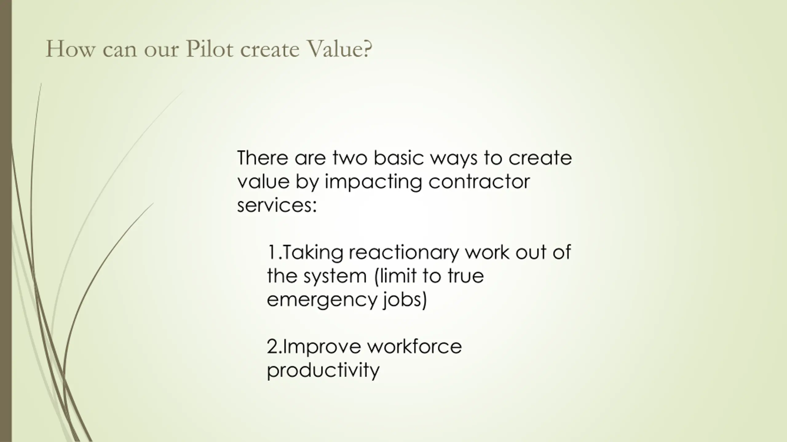 How can our Pilot create Value? There are two basic ways to create value by impacting contractor services: 1.Taking reactionary work out of the system (limit to true emergency jobs) 2.Improve workforce productivity