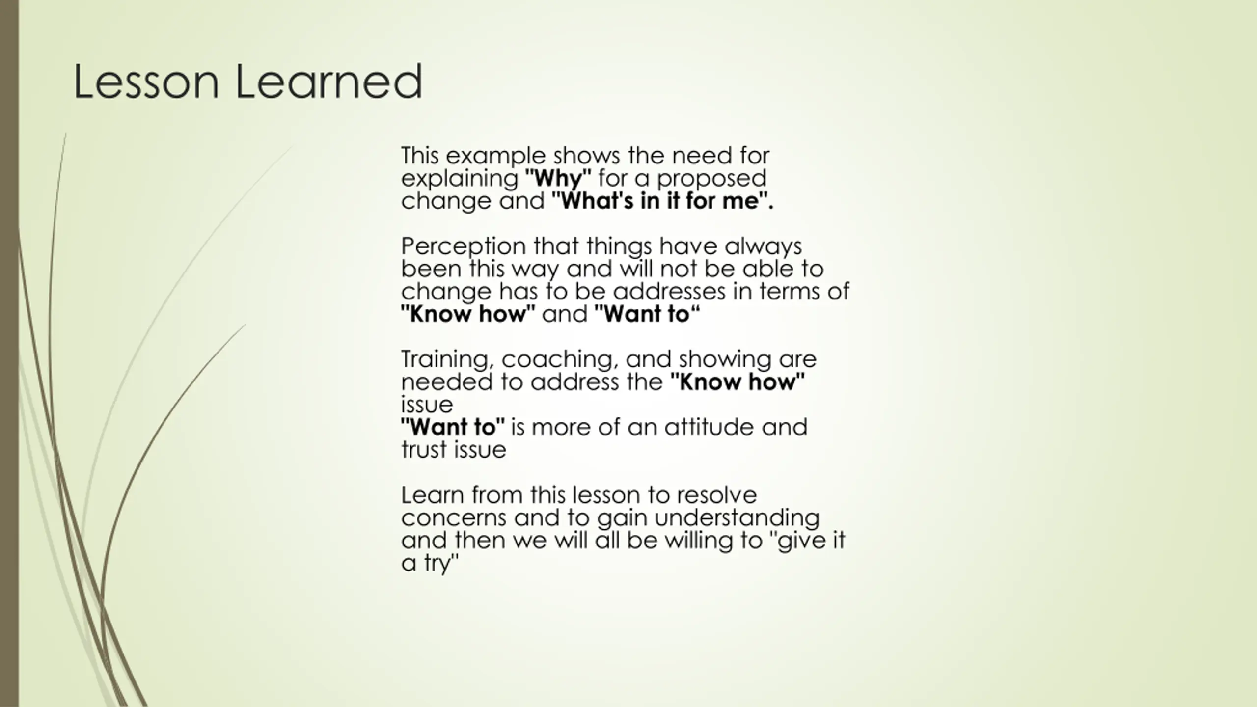 Lesson Learned This example shows the need for explaining "Why" for a proposed change and "What's in it for me". Perception that things have always been this way and will not be able to change has to be addresses in terms of "Know how" and "Want to Training, coaching, and showing are needed to address the "Know how" issue "Want to" is more of an attitude and trust issue Learn from this lesson to resolve concerns and to gain understanding and then we will all be willing to "give it a try"