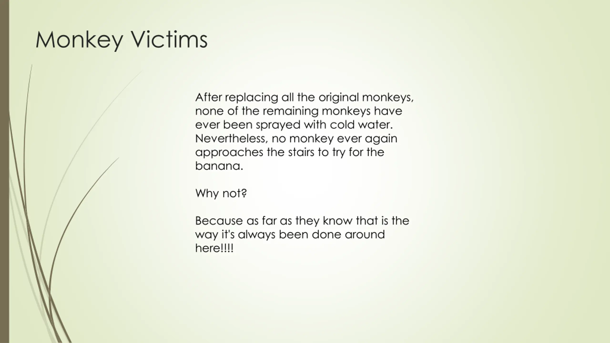 Monkey Victims After replacing all the original monkeys, none of the remaining monkeys have ever been sprayed with cold water. Nevertheless, no monkey ever again approaches the stairs to try for the banana. Why not? Because as far as they know that is the way it's always been done around here!!!!