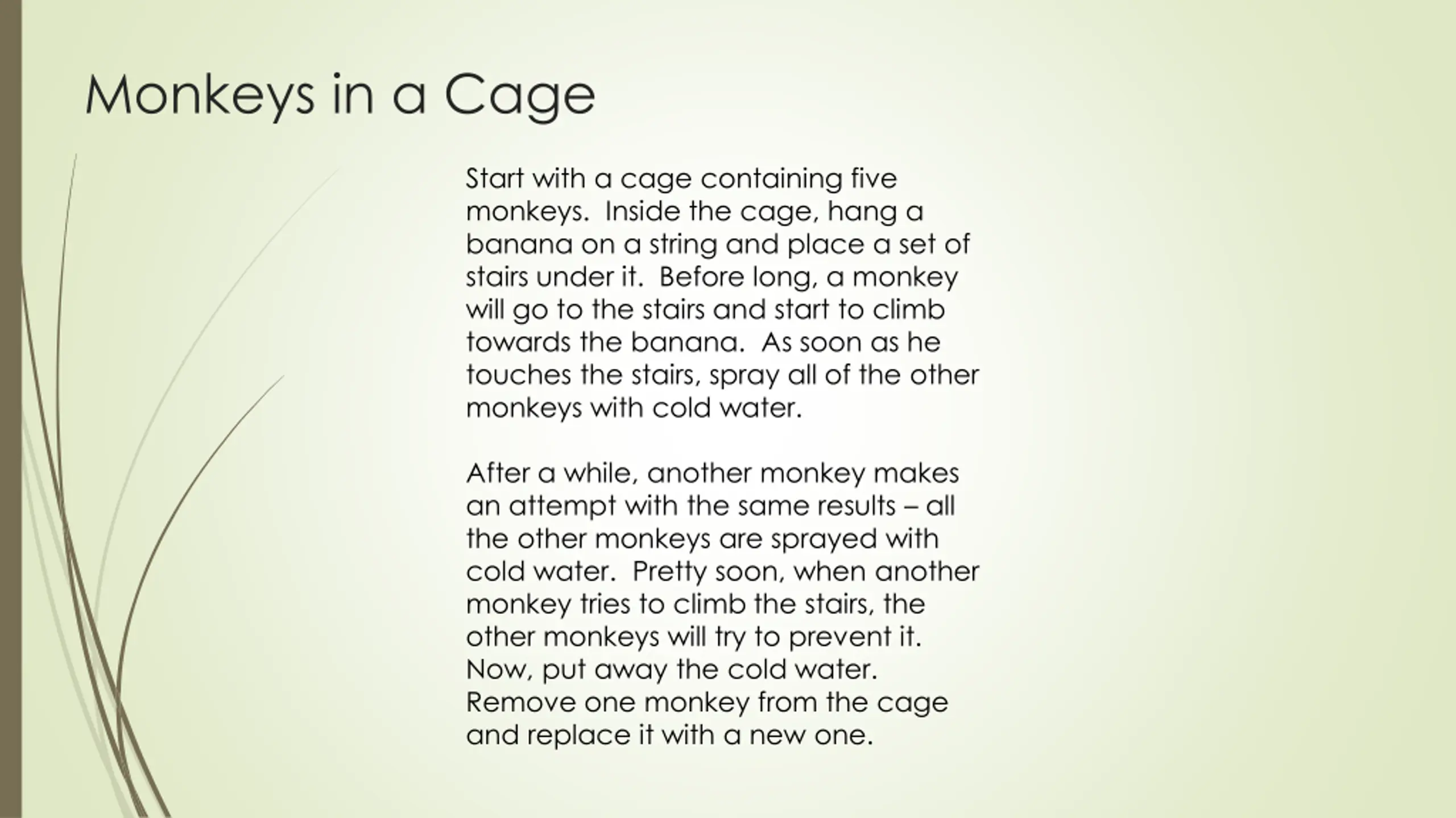 Monkeys in a Cage Start with a cage containing five monkeys. Inside the cage, hang a banana on a string and place a set of stairs under it. Before long, a monkey will go to the stairs and start to climb towards the banana. As soon as he touches the stairs, spray all of the other monkeys with cold water. After a while, another monkey makes an attempt with the same results all the other monkeys are sprayed with cold water. Pretty soon, when another monkey tries to climb the stairs, the other monkeys will try to prevent it. Now, put away the cold water. Remove one monkey from the cage and replace it with a new one.
