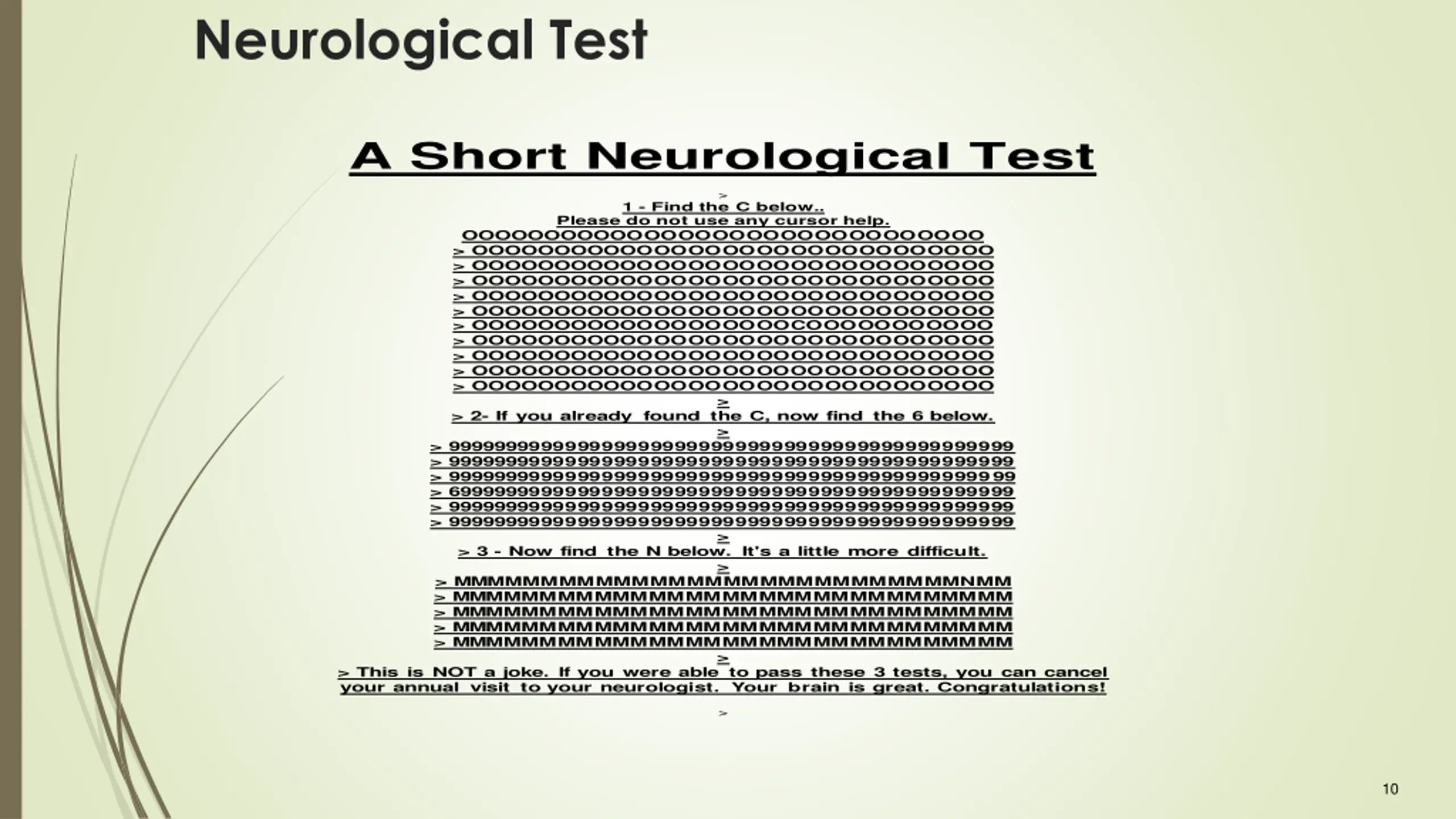 NeurologicalTest A Short Neurological Test > 1 - Find the C below.. Please do not use any cursor help. OOOOOOOOOOOOOOOOOOOOOOOOOOOOOOO > OOOOOOOOOOOOOOOOOOOOOOOOOOOOOOO > OOOOOOOOOOOOOOOOOOOOOOOOOOOOOOO > OOOOOOOOOOOOOOOOOOOOOOOOOOOOOOO > OOOOOOOOOOOOOOOOOOOOOOOOOOOOOOO > OOOOOOOOOOOOOOOOOOOOOOOOOOOOOOO > OOOOOOOOOOOOOOOOOOOCOOOOOOOOOOO > OOOOOOOOOOOOOOOOOOOOOOOOOOOOOOO > OOOOOOOOOOOOOOOOOOOOOOOOOOOOOOO > OOOOOOOOOOOOOOOOOOOOOOOOOOOOOOO > OOOOOOOOOOOOOOOOOOOOOOOOOOOOOOO > > 2- If you already found the C, now find the 6 below. > > 99999999999999999999999999999999999999999999999 > 99999999999999999999999999999999999999999999999 > 99999999999999999999999999999999999999999999999 > 69999999999999999999999999999999999999999999999 > 99999999999999999999999999999999999999999999999 > 99999999999999999999999999999999999999999999999 > > 3 - Now find the N below. It's a little more difficult. > > MMMMMMMMMMMMMMMMMMMMMMMMMMMMNMM > MMMMMMMMMMMMMMMMMMMMMMMMMMMMMMM > MMMMMMMMMMMMMMMMMMMMMMMMMMMMMMM > MMMMMMMMMMMMMMMMMMMMMMMMMMMMMMM > MMMMMMMMMMMMMMMMMMMMMMMMMMMMMMM > > This is NOT a joke. If you were able to pass these 3 tests, you can cancel your annual visit to your neurologist. Your brain is great.Congratulations! > 10