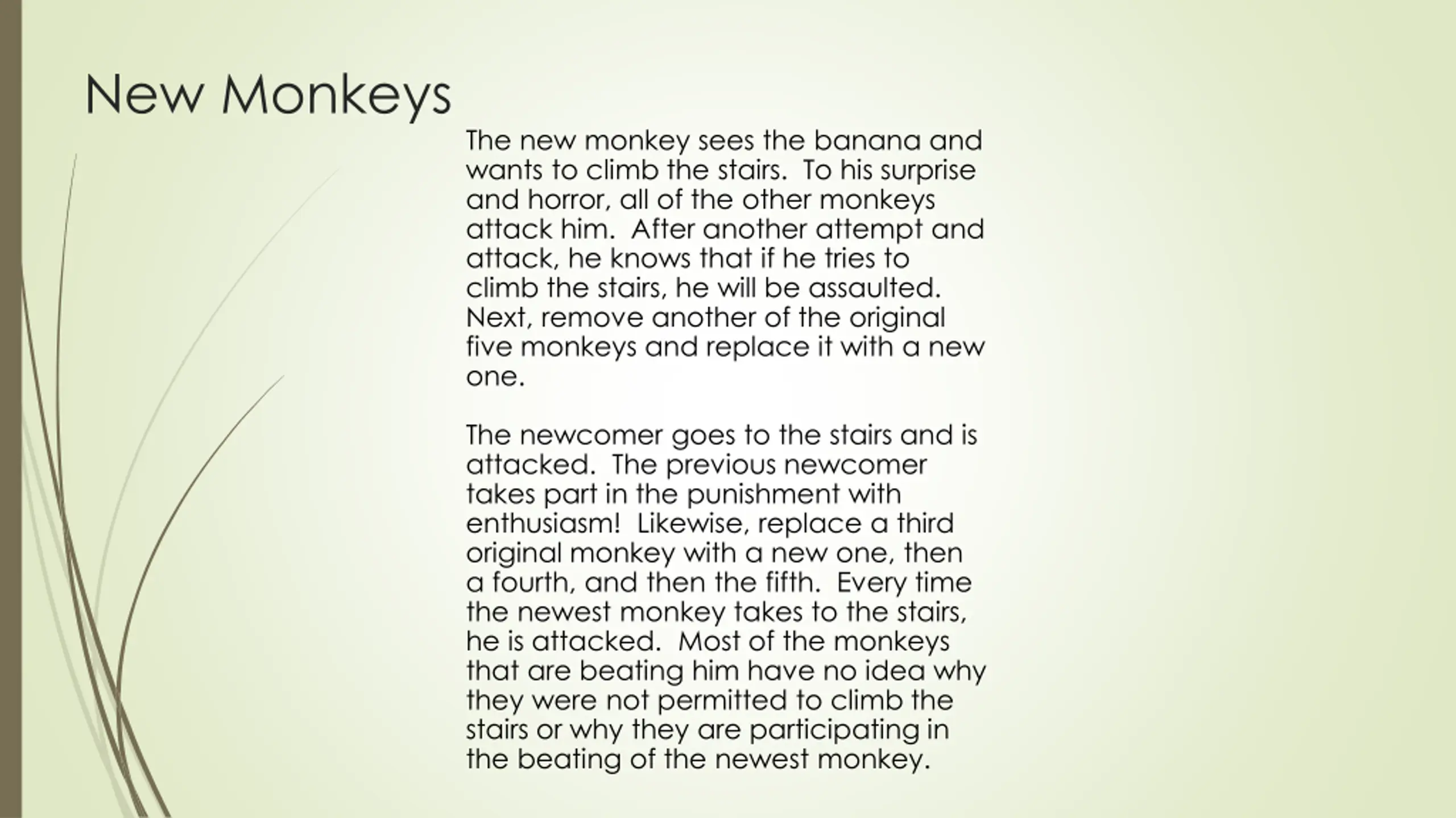 New Monkeys The new monkey sees the banana and wants to climb the stairs. To his surprise and horror, all of the other monkeys attack him. After another attempt and attack, he knows that if he tries to climb the stairs, he will be assaulted. Next, remove another of the original five monkeys and replace it with a new one. The newcomer goes to the stairs and is attacked. The previous newcomer takes part in the punishment with enthusiasm! Likewise, replace a third original monkey with a new one, then a fourth, and then the fifth. Every time the newest monkey takes to the stairs, he is attacked. Most of the monkeys that are beating him have no idea why they were not permitted to climb the stairs or why they are participating in the beating of the newest monkey.