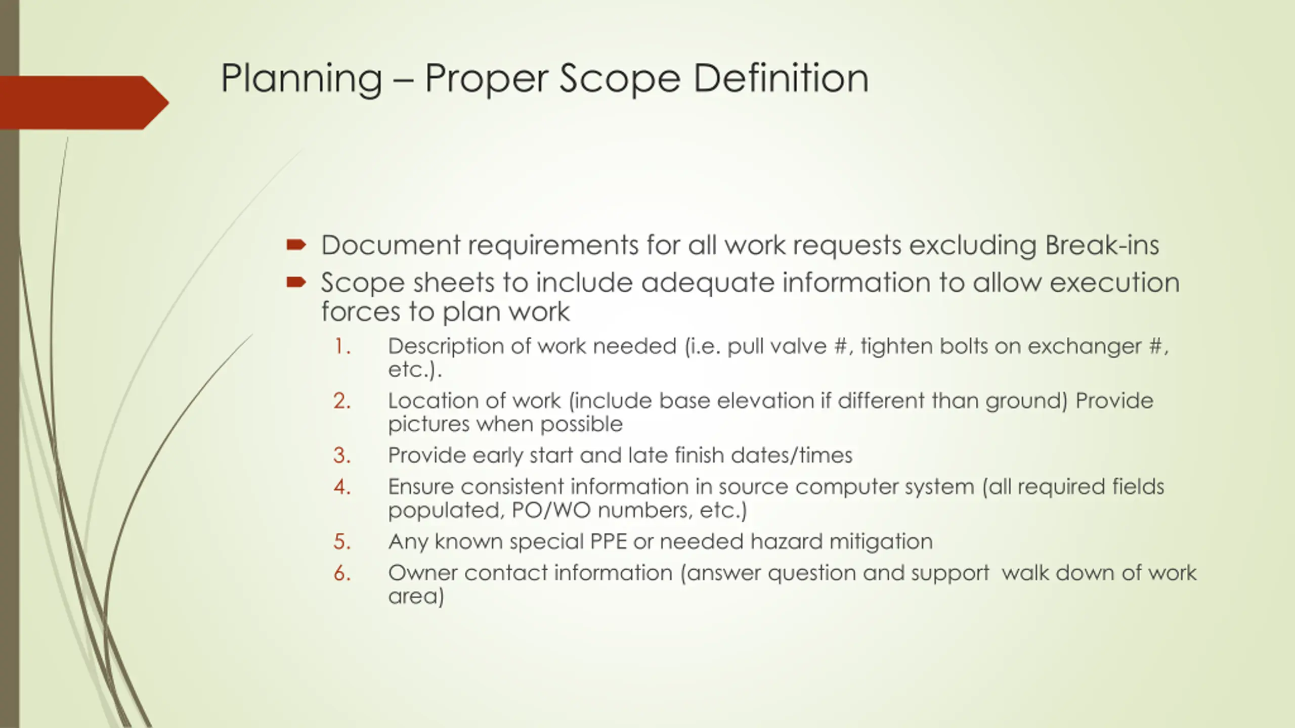 Planning Proper Scope Definition Document requirements for all work requests excluding Break-ins Scope sheets to include adequate information to allow execution forces to plan work 1. Description of work needed (i.e. pull valve #, tighten bolts on exchanger #, etc.). 2. Location of work (include base elevation if different than ground) Provide pictures when possible 3. Provide early start and late finish dates/times 4. Ensure consistent information in source computer system (all required fields populated, PO/WO numbers, etc.) 5. Any known special PPE or needed hazard mitigation 6. Owner contact information (answer question and support walk down of work area)