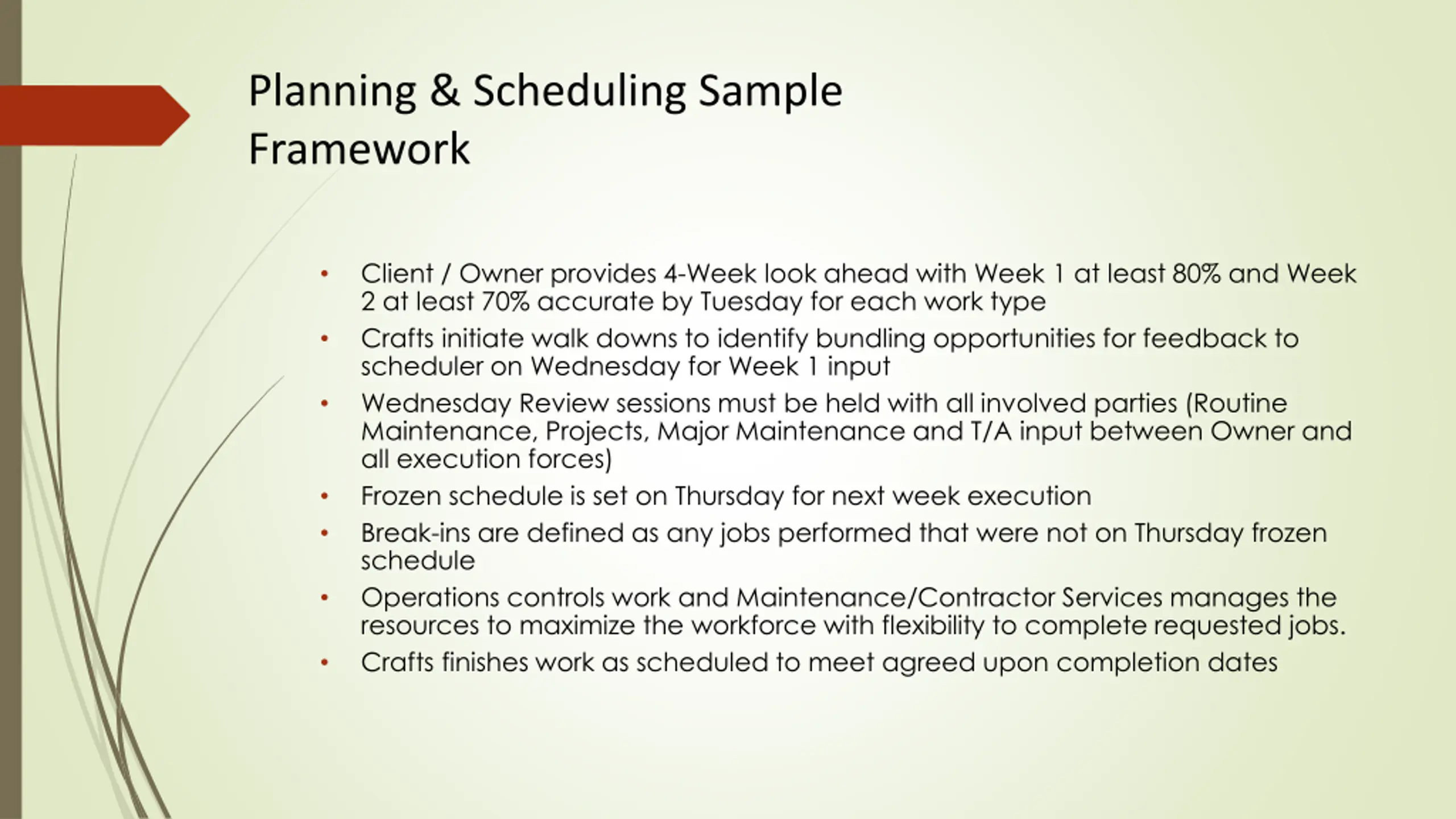 Planning & Scheduling Sample Framework Client / Owner provides 4-Week look ahead with Week 1 at least 80% and Week 2 at least 70% accurate by Tuesday for each work type Crafts initiate walk downs to identify bundling opportunities for feedback to scheduler on Wednesday for Week 1 input Wednesday Review sessions must be held with all involved parties (Routine Maintenance, Projects, Major Maintenance and T/A input between Owner and all execution forces) Frozen schedule is set on Thursday for next week execution Break-ins are defined as any jobs performed that were not on Thursday frozen schedule Operations controls work and Maintenance/Contractor Services manages the resources to maximize the workforce with flexibility to complete requested jobs. Crafts finishes work as scheduled to meet agreed upon completion dates
