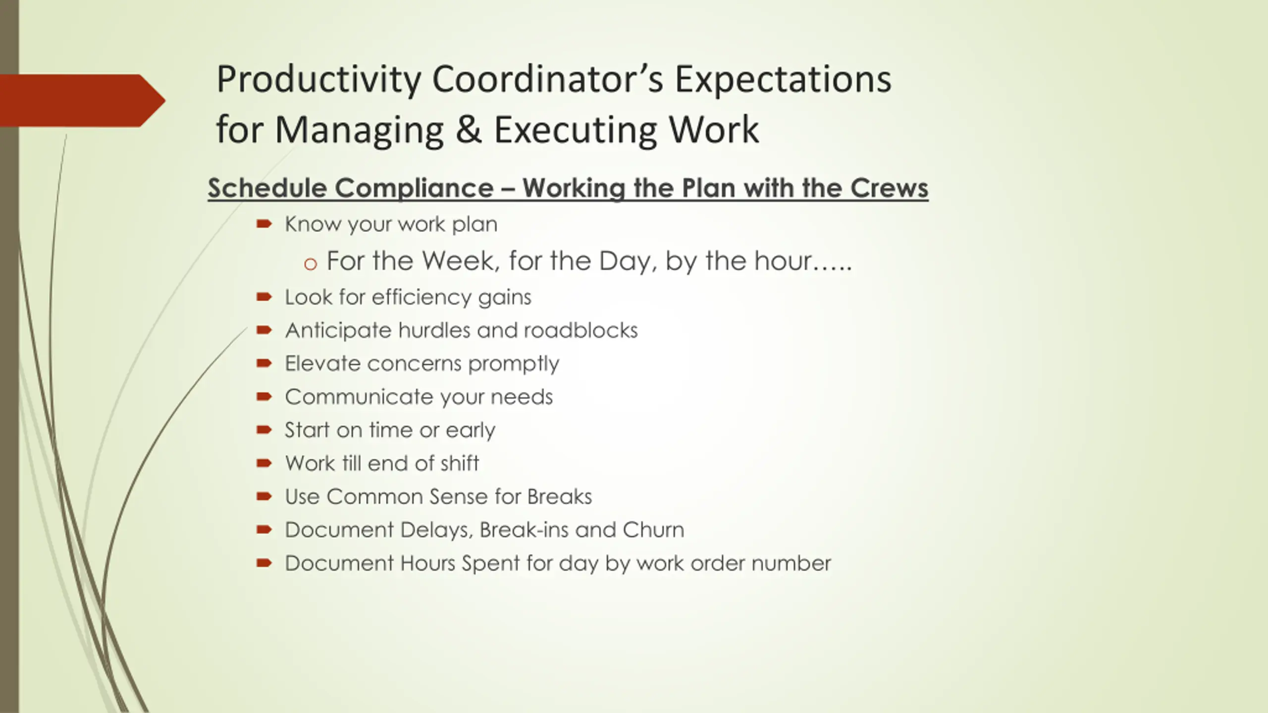 Productivity Coordinators Expectations for Managing & Executing Work Schedule Compliance Working the Plan with the Crews Know your work plan o For the Week, for the Day, by the hour .. Look for efficiency gains Anticipate hurdles and roadblocks Elevate concerns promptly Communicate your needs Start on time or early Work till end of shift Use Common Sense for Breaks Document Delays, Break-ins and Churn Document Hours Spent for day by work order number