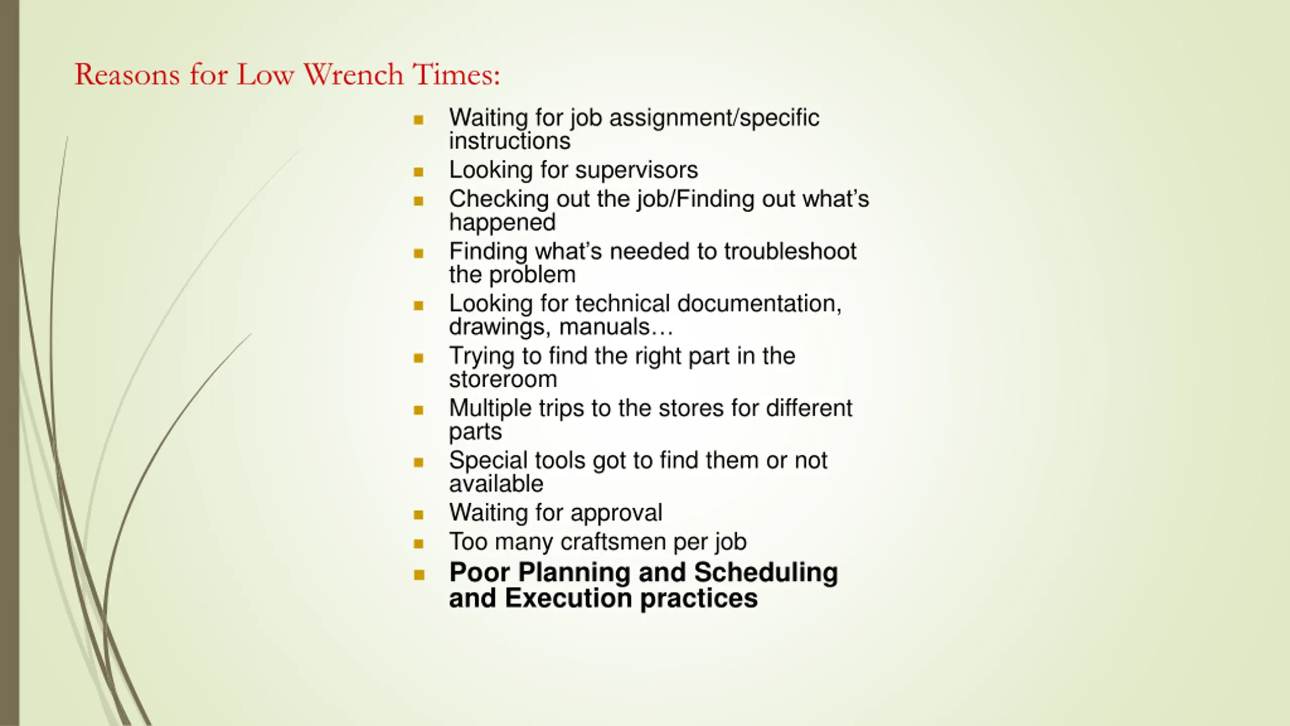 Reasons for Low Wrench Times: Waiting for job assignment/specific instructions Looking for supervisors Checking out the job/Finding out what s happened Finding what s needed to troubleshoot the problem Looking for technical documentation, drawings, manuals Trying to find the right part in the storeroom Multiple trips to the stores for different parts Special tools got to find them or not available Waiting for approval Too many craftsmen per job Poor Planning and Scheduling and Execution practices