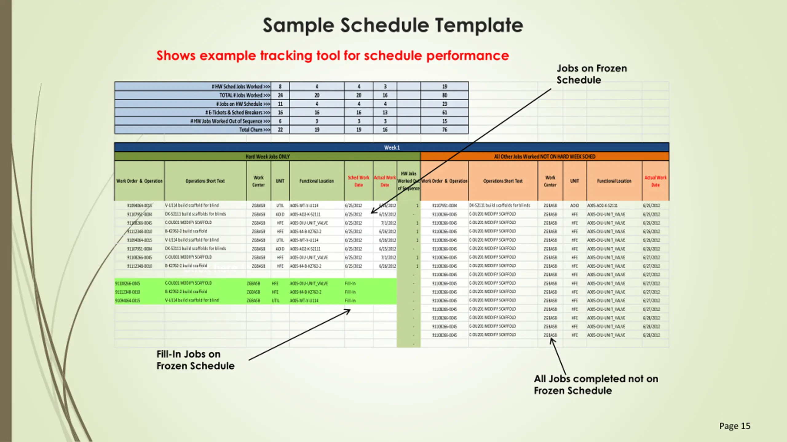 Sample Schedule Template Shows example tracking tool for schedule performance Jobs on Frozen Schedule # HW Sched Jobs Worked >>> TOTAL # Jobs Worked >>> # Jobs on HW Schedule >>> # E-Tickets & Sched Breakers >>> # HW Jobs Worked Out of Sequence >>> 8 24 11 16 6 22 4 20 4 16 3 19 4 3 19 80 23 61 15 76 20 4 16 3 19 16 4 13 3 16 Total Churn >>> Week 1 Hard Week Jobs ONLY All Other Jobs Worked NOT ON HARD WEEK SCHED HW Jobs Worked Out of Sequence Work Center Sched Work Date Actual Work Date Work Center Actual Work Date Work Order & Operation Operations Short Text UNIT Functional Location Work Order & Operation Operations Short Text UNIT Functional Location V-U114 build scaffold for blind DK-S2111 build scaffolds for blinds 91094064-0015 ZGBASB UTIL A005-WT-V-U114 6/25/2012 6/26/2012 1 91107951-0004 ZGBASB AOID A005-AO2-K-S2111 6/25/2012 DK-S2111 build scaffolds for blinds C-OU201 MODIFY SCAFFOLD 91107951-0004 ZGBASB AOID A005-AO2-K-S2111 6/25/2012 6/25/2012 - 91108266-0045 ZGBASB HFE A005-OIU-UNIT_VALVE 6/25/2012 C-OU201 MODIFY SCAFFOLD C-OU201 MODIFY SCAFFOLD 91108266-0045 ZGBASB HFE A005-OIU-UNIT_VALVE 6/25/2012 7/1/2012 1 91108266-0045 ZGBASB HFE A005-OIU-UNIT_VALVE 6/26/2012 B-K2762-2 build scaffold C-OU201 MODIFY SCAFFOLD 91112348-0010 ZGBASB HFE A005-K4-B-K2762-2 6/25/2012 6/26/2012 1 91108266-0045 ZGBASB HFE A005-OIU-UNIT_VALVE 6/26/2012 V-U114 build scaffold for blind C-OU201 MODIFY SCAFFOLD 91094064-0015 ZGBASB UTIL A005-WT-V-U114 6/25/2012 6/26/2012 1 91108266-0045 ZGBASB HFE A005-OIU-UNIT_VALVE 6/26/2012 DK-S2111 build scaffolds for blinds C-OU201 MODIFY SCAFFOLD 91107951-0004 ZGBASB AOID A005-AO2-K-S2111 6/25/2012 6/25/2012 - 91108266-0045 ZGBASB HFE A005-OIU-UNIT_VALVE 6/26/2012 C-OU201 MODIFY SCAFFOLD C-OU201 MODIFY SCAFFOLD 91108266-0045 ZGBASB HFE A005-OIU-UNIT_VALVE 6/25/2012 7/1/2012 1 91108266-0045 ZGBASB HFE A005-OIU-UNIT_VALVE 6/27/2012 Click here to expand B-K2762-2 build scaffold B-K2762-2 build scaffold C-OU201 MODIFY SCAFFOLD 91112348-0010 ZGBASB HFE A005-K4-B-K2762-2 6/25/2012 6/26/2012 1 91108266-0045 ZGBASB HFE A005-OIU-UNIT_VALVE 6/27/2012 C-OU201 MODIFY SCAFFOLD - 91108266-0045 ZGBASB HFE A005-OIU-UNIT_VALVE 6/27/2012 C-OU201 MODIFY SCAFFOLD C-OU201 MODIFY SCAFFOLD 91108266-0045 ZGBASB HFE A005-OIU-UNIT_VALVE Fill-In - 91108266-0045 ZGBASB HFE A005-OIU-UNIT_VALVE 6/27/2012 C-OU201 MODIFY SCAFFOLD 91112348-0010 ZGBASB HFE A005-K4-B-K2762-2 Fill-In - 91108266-0045 ZGBASB HFE A005-OIU-UNIT_VALVE 6/27/2012 V-U114 build scaffold for blind C-OU201 MODIFY SCAFFOLD 91094064-0015 ZGBASB UTIL A005-WT-V-U114 Fill-In - 91108266-0045 ZGBASB HFE A005-OIU-UNIT_VALVE 6/27/2012 C-OU201 MODIFY SCAFFOLD - 91108266-0045 ZGBASB HFE A005-OIU-UNIT_VALVE 6/27/2012 C-OU201 MODIFY SCAFFOLD - 91108266-0045 ZGBASB HFE A005-OIU-UNIT_VALVE 6/28/2012 C-OU201 MODIFY SCAFFOLD - 91108266-0045 ZGBASB HFE A005-OIU-UNIT_VALVE 6/28/2012 C-OU201 MODIFY SCAFFOLD - 91108266-0045 ZGBASB HFE A005-OIU-UNIT_VALVE 6/28/2012 - Fill-In Jobs on Frozen Schedule All Jobs completed not on Frozen Schedule Page 15