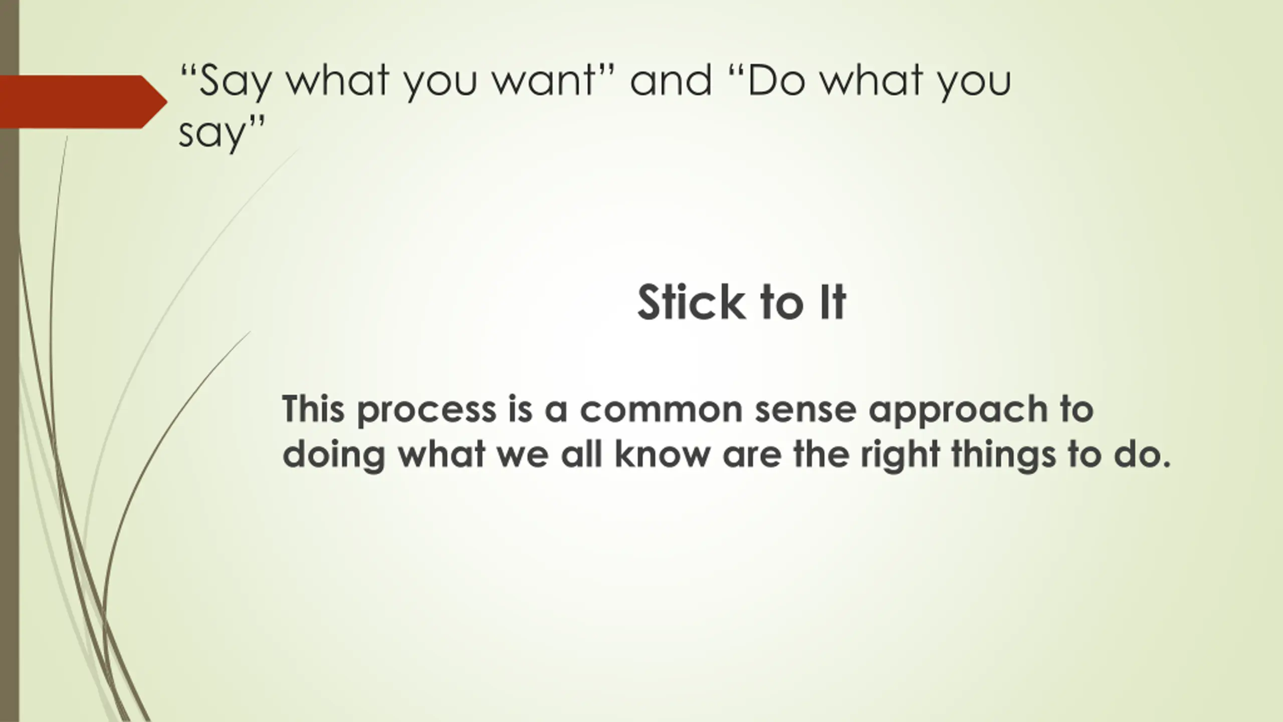 Say what you want and Do what you say Stick to It This process is a common sense approach to doing what we all know are the right things to do.