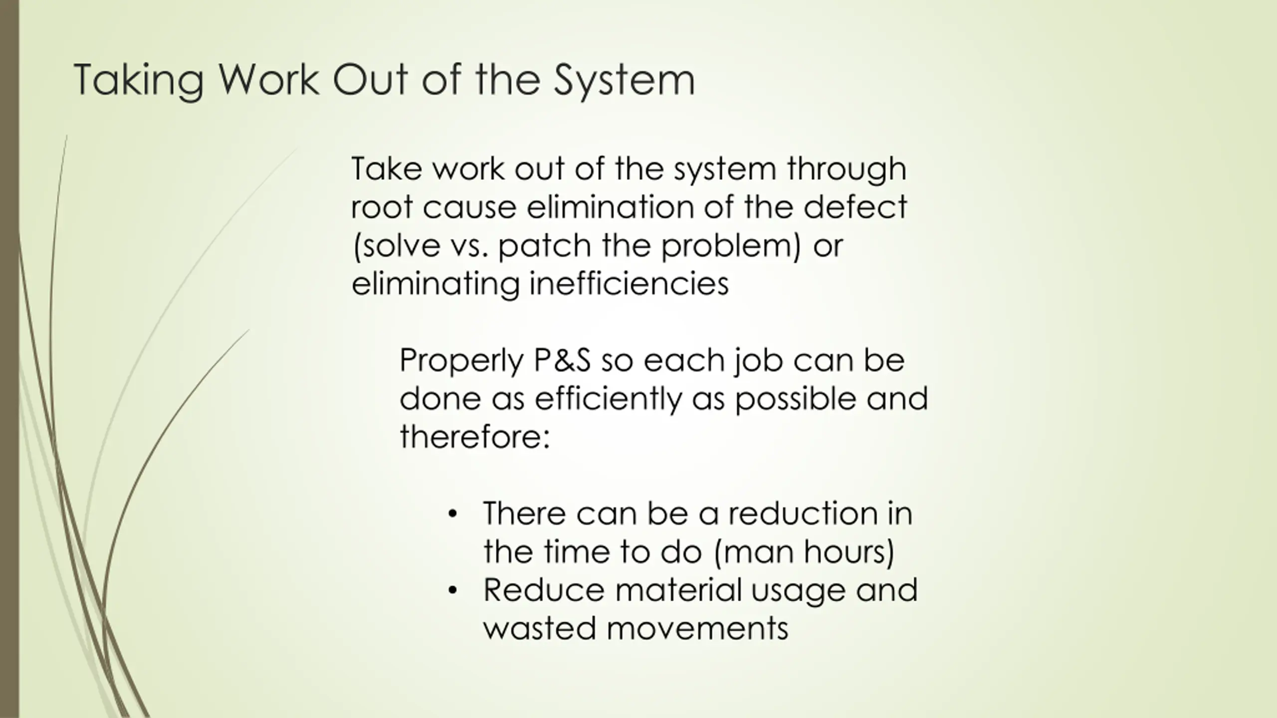 Taking Work Out of the System Take work out of the system through root cause elimination of the defect (solve vs. patch the problem) or eliminating inefficiencies Properly P&S so each job can be done as efficiently as possible and therefore: There can be a reduction in the time to do (man hours) Reduce material usage and wasted movements