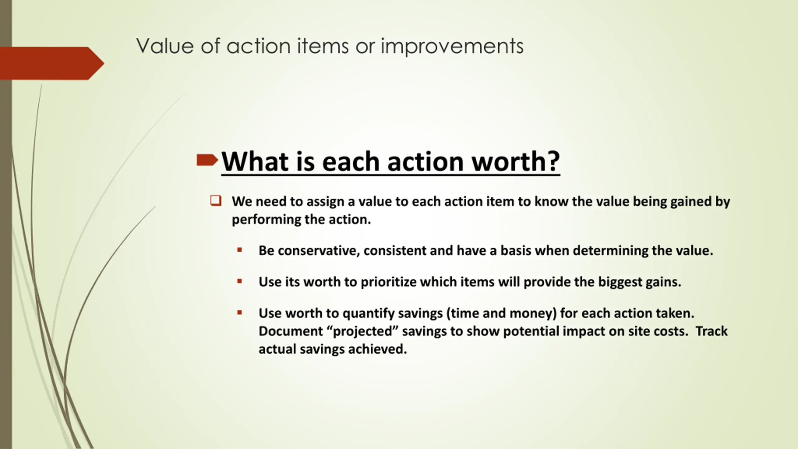 Value of action items or improvements What is each action worth? We need to assign a value to each action item to know the value being gained by performing the action. Be conservative, consistent and have a basis when determining the value. Use its worth to prioritize which items will provide the biggest gains. Use worth to quantify savings (time and money) for each action taken. Document projected savings to show potential impact on site costs. Track actual savings achieved.