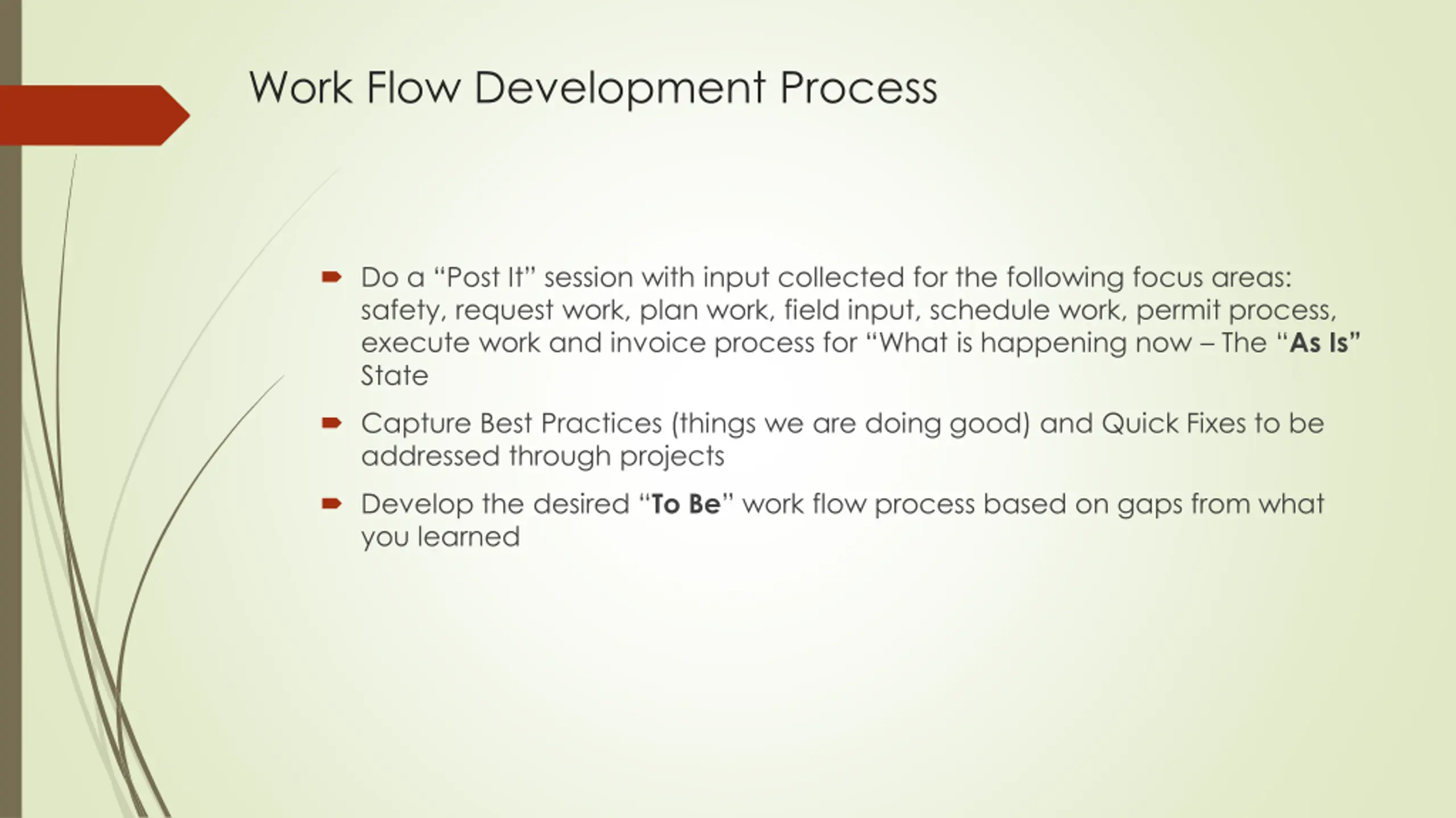 Work Flow Development Process Do a Post It session with input collected for the following focus areas: safety, request work, plan work, field input, schedule work, permit process, execute work and invoice process for What is happening now The As Is State Capture Best Practices (things we are doing good) and Quick Fixes to be addressed through projects Develop the desired To Be work flow process based on gaps from what you learned