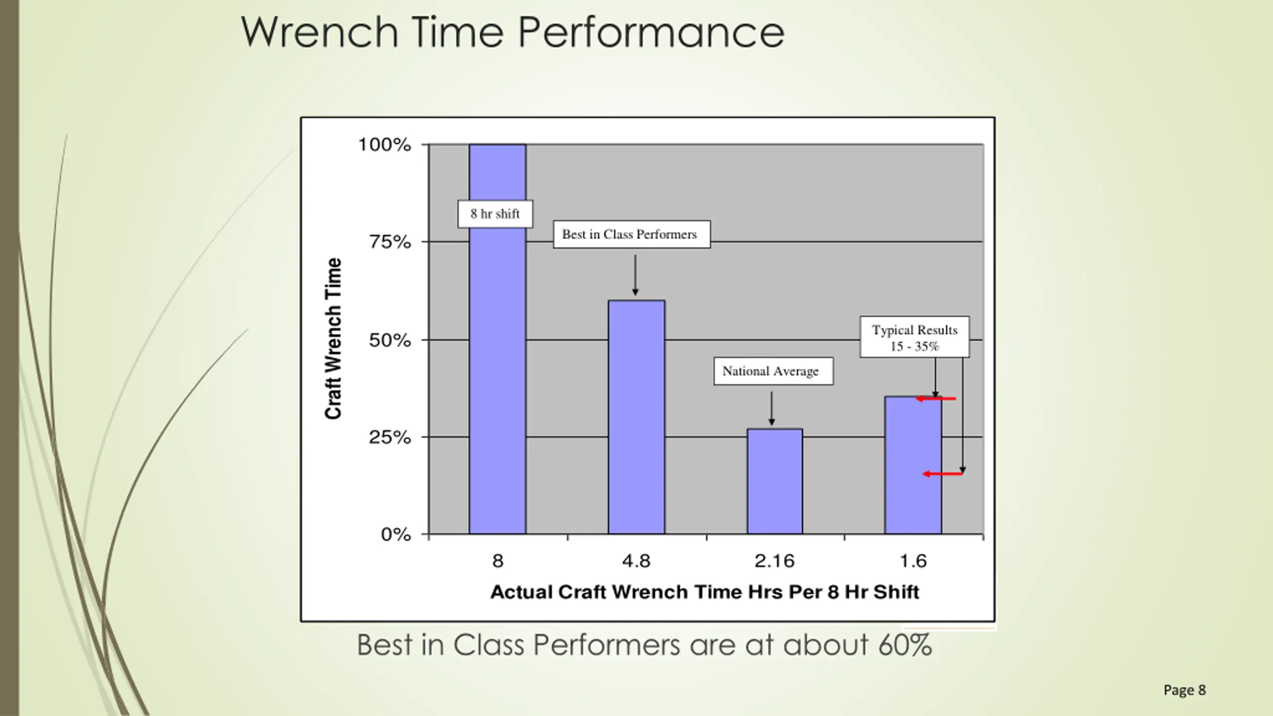 Wrench Time Performance 100% 8 hr shift Best in Class Performers 75% Craft Wrench Time Typical Results 15 - 35% 50% National Average 25% 0% 8 Actual Craft Wrench Time Hrs Per 8 Hr Shift 4.8 2.16 1.6 Best in Class Performers are at about 60% Page 8