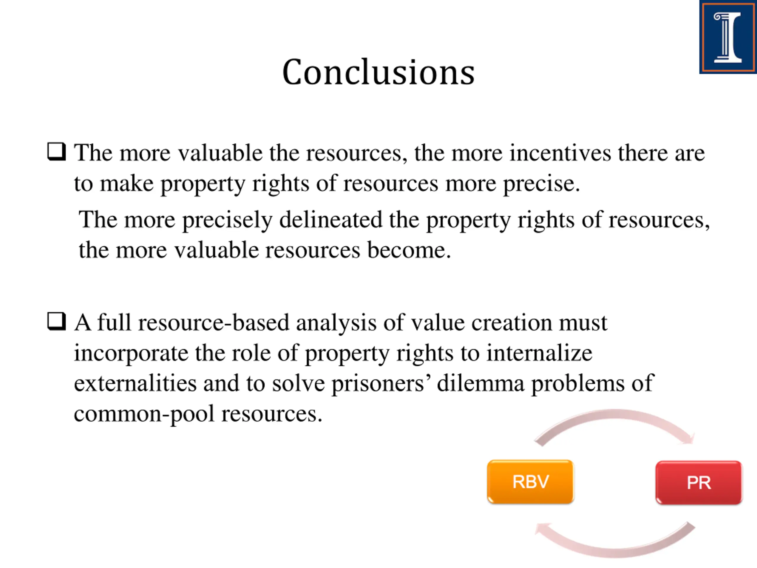 Conclusions The more valuable the resources, the more incentives there are to make property rights of resources more precise. The more precisely delineated the property rights of resources, the more valuable resources become. A full resource-based analysis of value creation must incorporate the role of property rights to internalize externalities and to solve prisoners dilemma problems of common-pool resources.