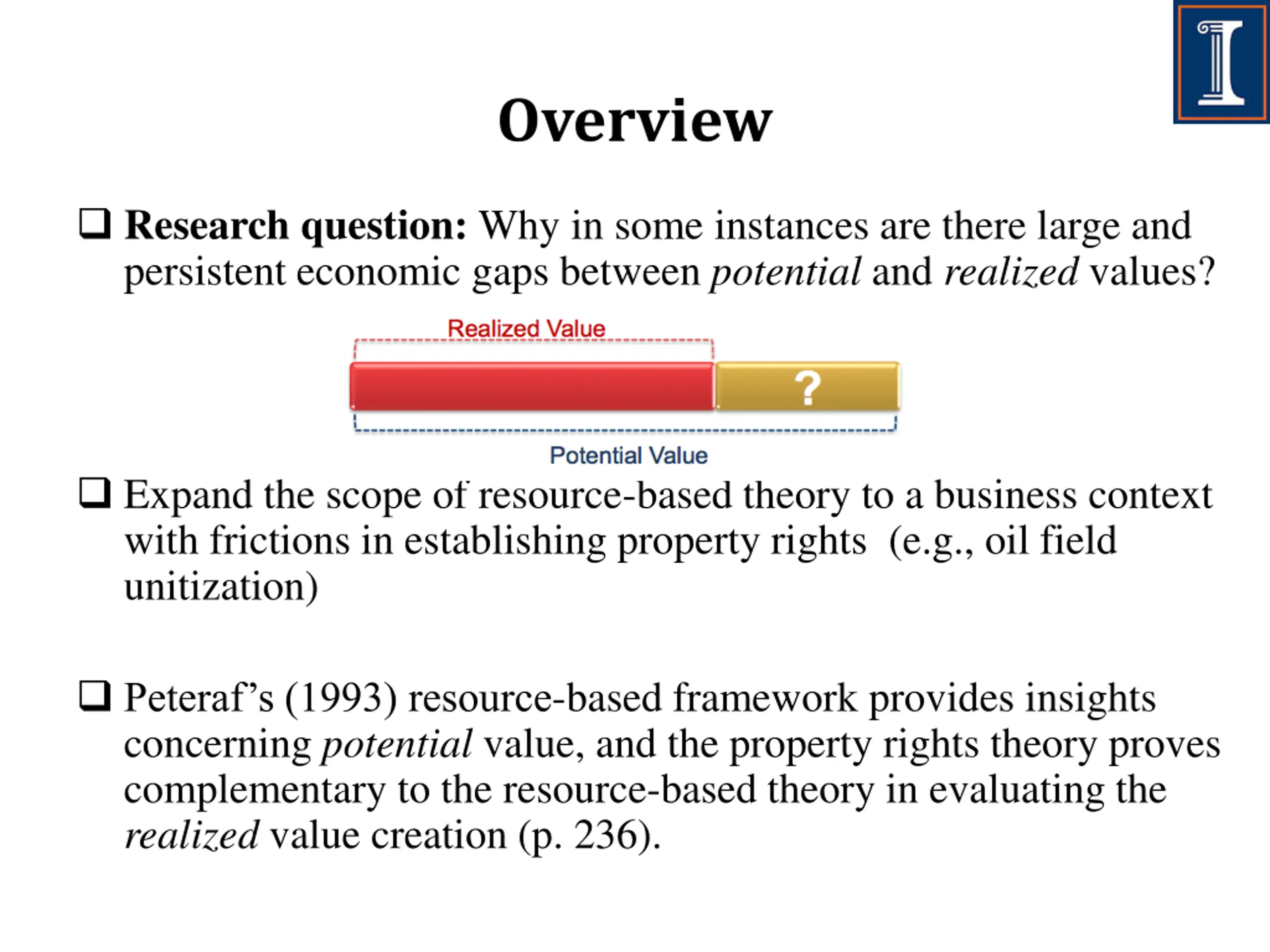 Overview Research question: Why in some instances are there large and persistent economic gaps between potential and realized values? Expand the scope of resource-based theory to a business context with frictions in establishing property rights (e.g., oil field unitization) Peteraf s (1993) resource-based framework provides insights concerning potential value, and the property rights theory proves complementary to the resource-based theory in evaluating the realized value creation (p. 236).