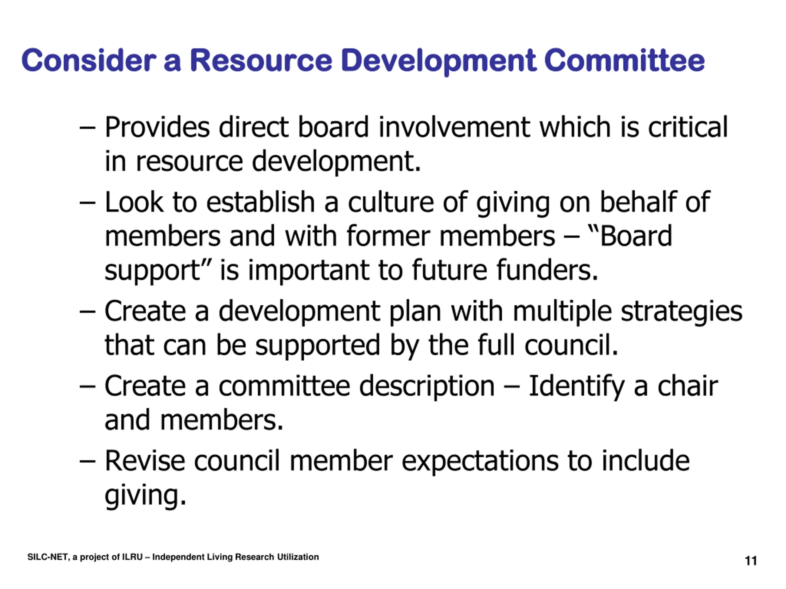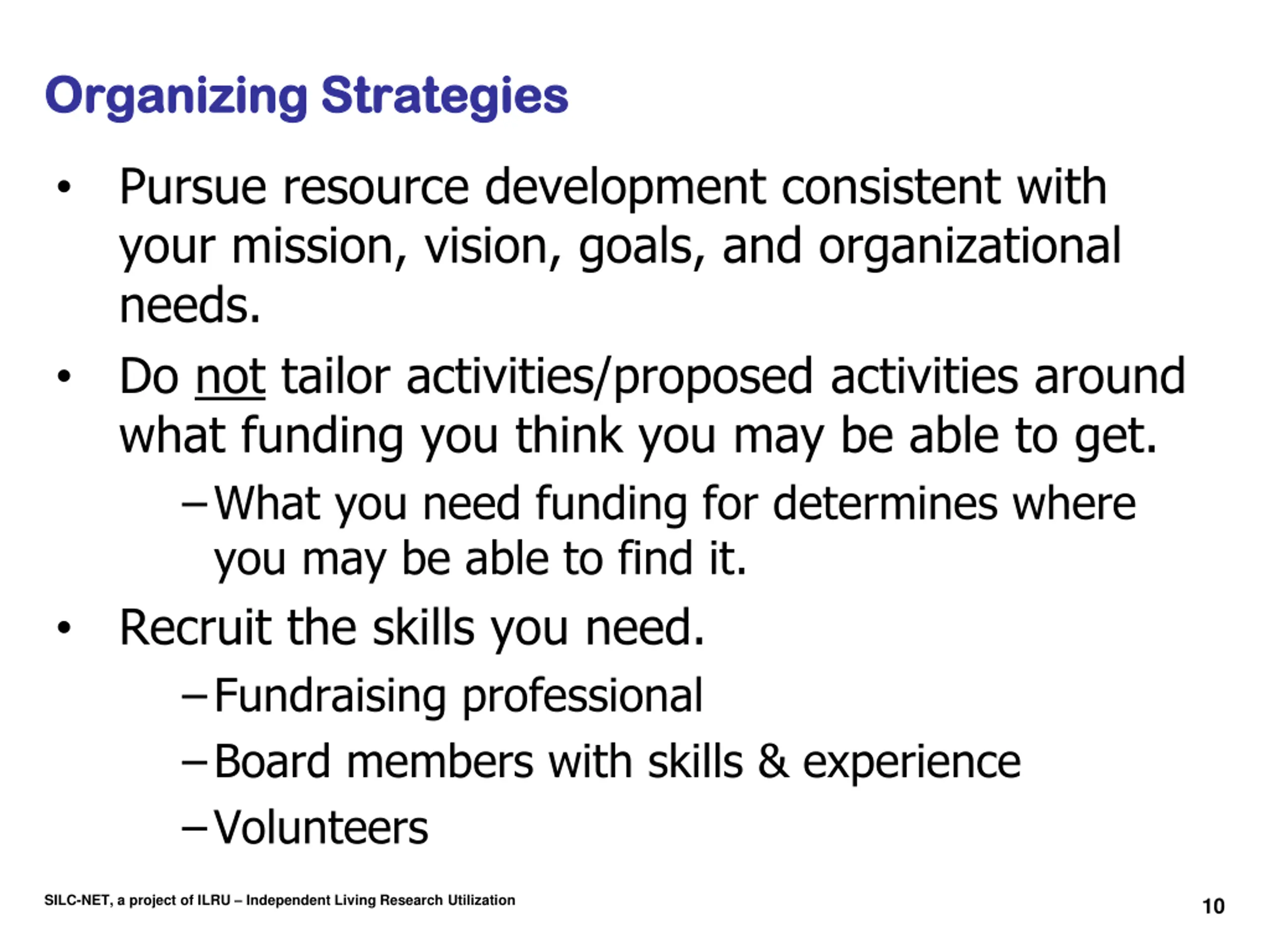 Organizing Strategies Organizing Strategies Pursue resource development consistent with your mission, vision, goals, and organizational needs. Do not tailor activities/proposed activities around what funding you think you may be able to get. What you need funding for determines where you may be able to find it. Recruit the skills you need. Fundraising professional Board members with skills & experience Volunteers SILC-NET, a project of ILRU Independent Living Research Utilization 10