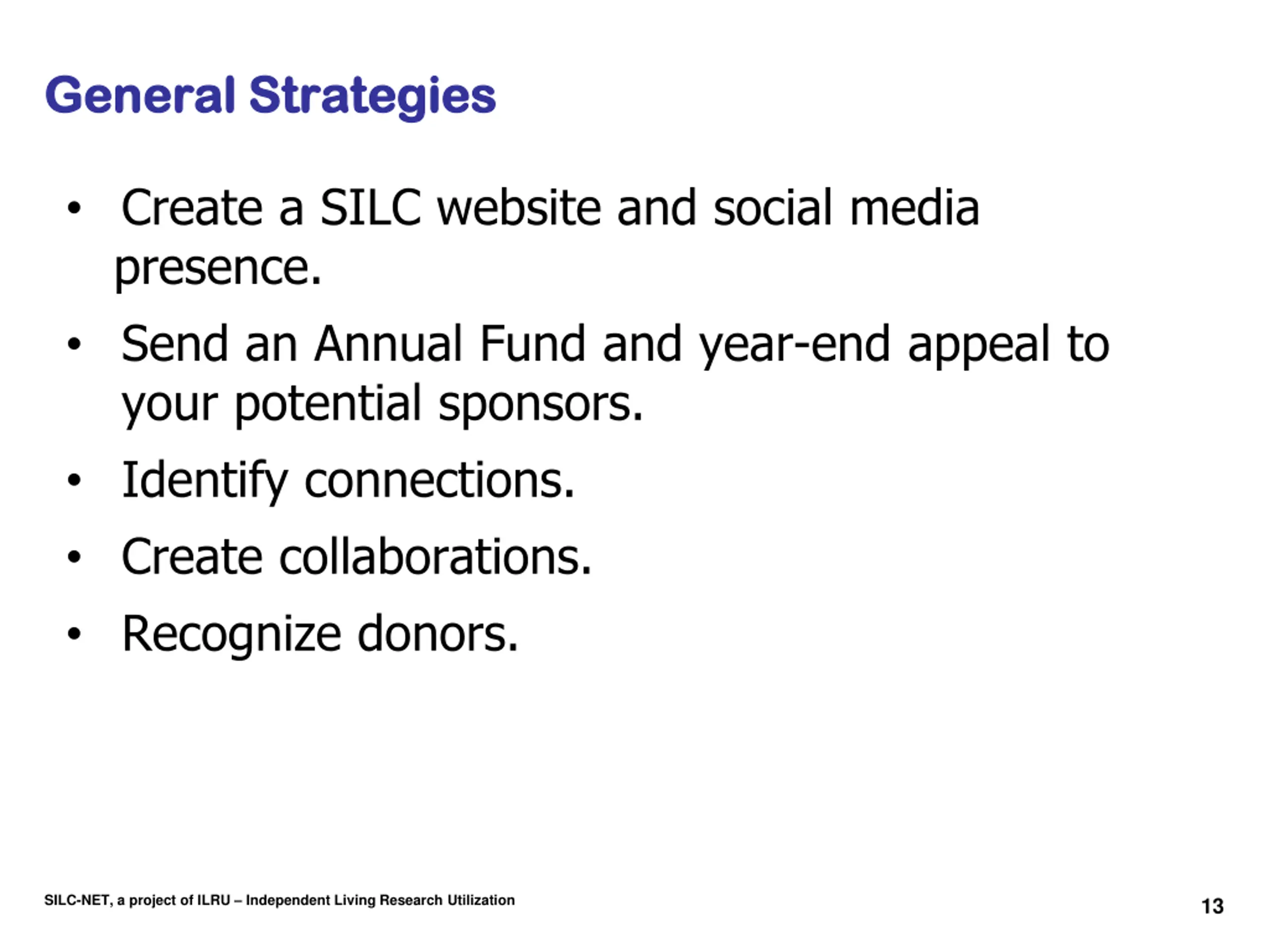 General Strategies General Strategies Create a SILC website and social media presence. Send an Annual Fund and year-end appeal to your potential sponsors. Identify connections. Create collaborations. Recognize donors. SILC-NET, a project of ILRU Independent Living Research Utilization 13