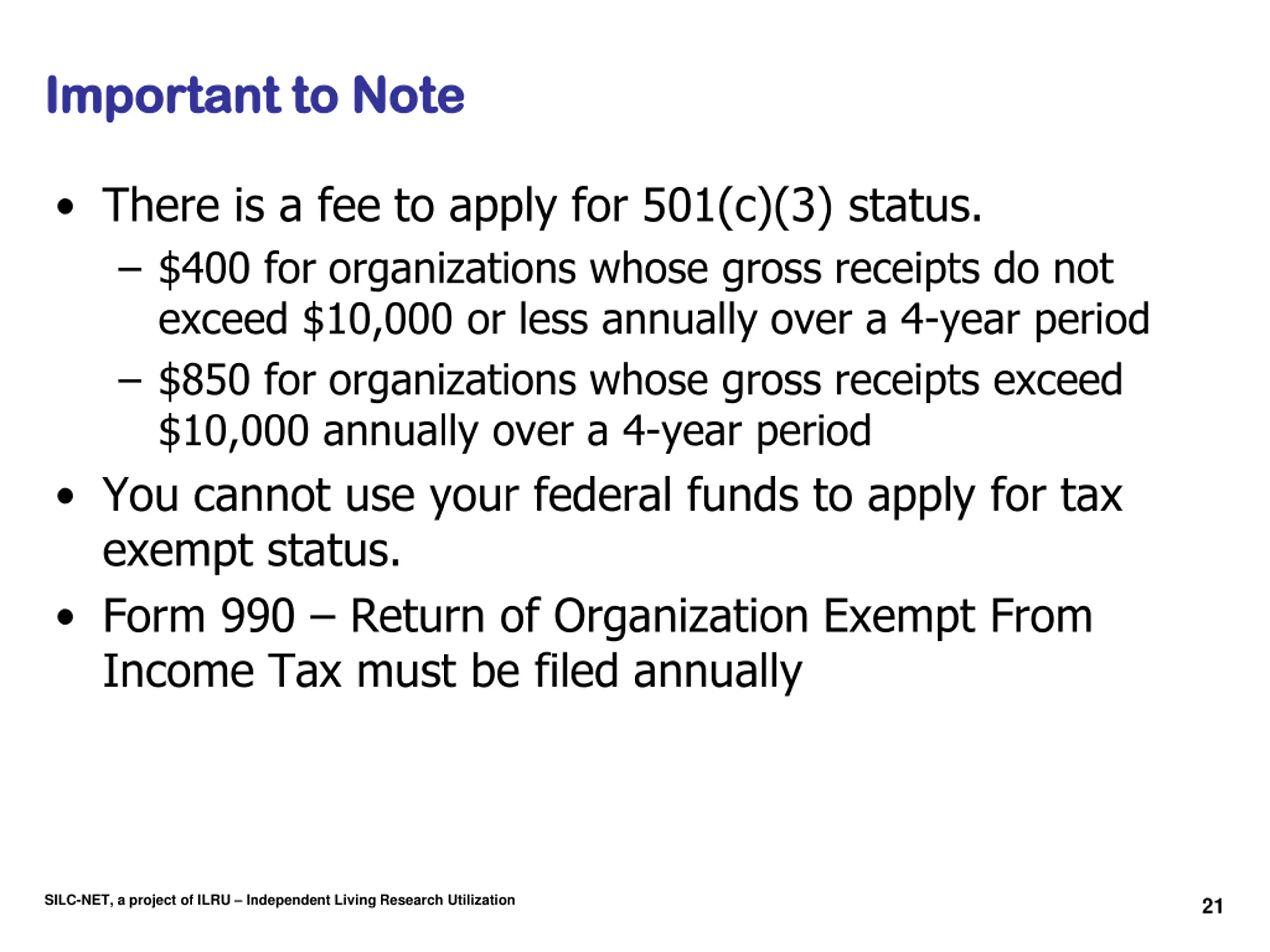 Important to Note Important to Note There is a fee to apply for 501(c)(3) status. $400 for organizations whose gross receipts do not exceed $10,000 or less annually over a 4-year period $850 for organizations whose gross receipts exceed $10,000 annually over a 4-year period You cannot use your federal funds to apply for tax exempt status. Form 990 Return of Organization Exempt From Income Tax must be filed annually SILC-NET, a project of ILRU Independent Living Research Utilization 21