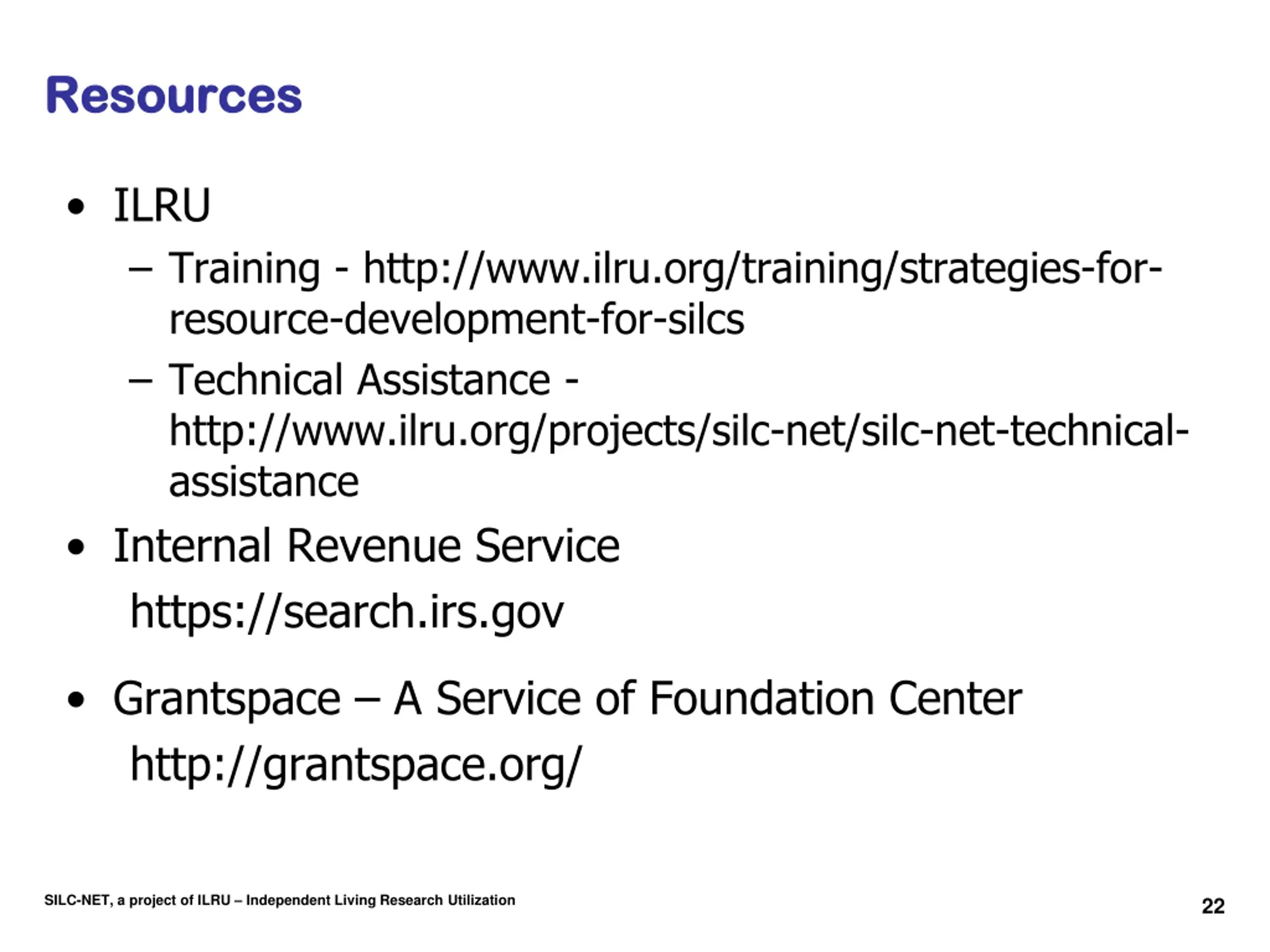 Resources Resources ILRU Training - http://www.ilru.org/training/strategies-for- resource-development-for-silcs Technical Assistance - http://www.ilru.org/projects/silc-net/silc-net-technical- assistance Internal Revenue Service https://search.irs.gov Grantspace A Service of Foundation Center http://grantspace.org/ SILC-NET, a project of ILRU Independent Living Research Utilization 22