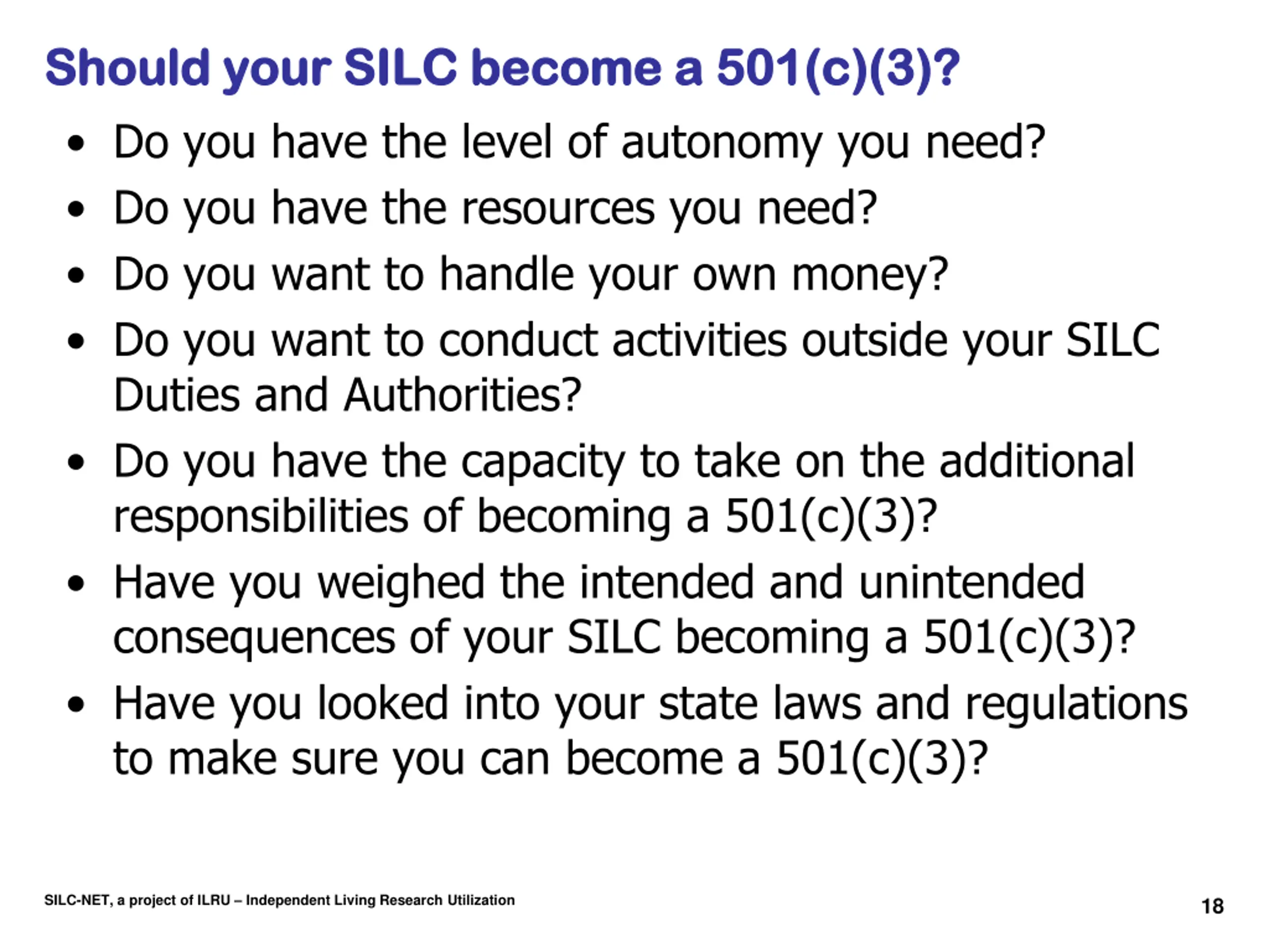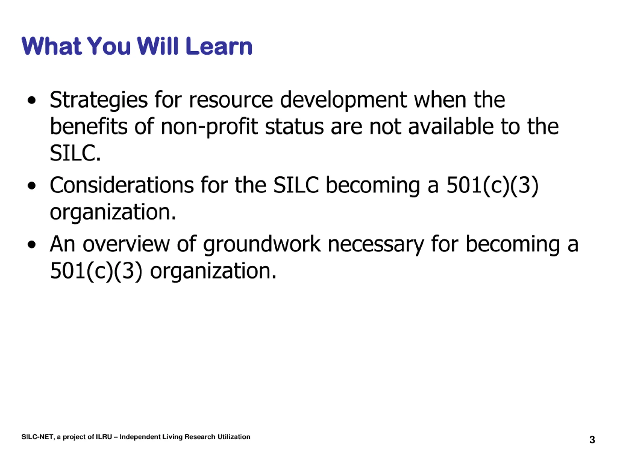 What You Will Learn What You Will Learn Strategies for resource development when the benefits of non-profit status are not available to the SILC. Considerations for the SILC becoming a 501(c)(3) organization. An overview of groundwork necessary for becoming a 501(c)(3) organization. SILC-NET, a project of ILRU Independent Living Research Utilization 3
