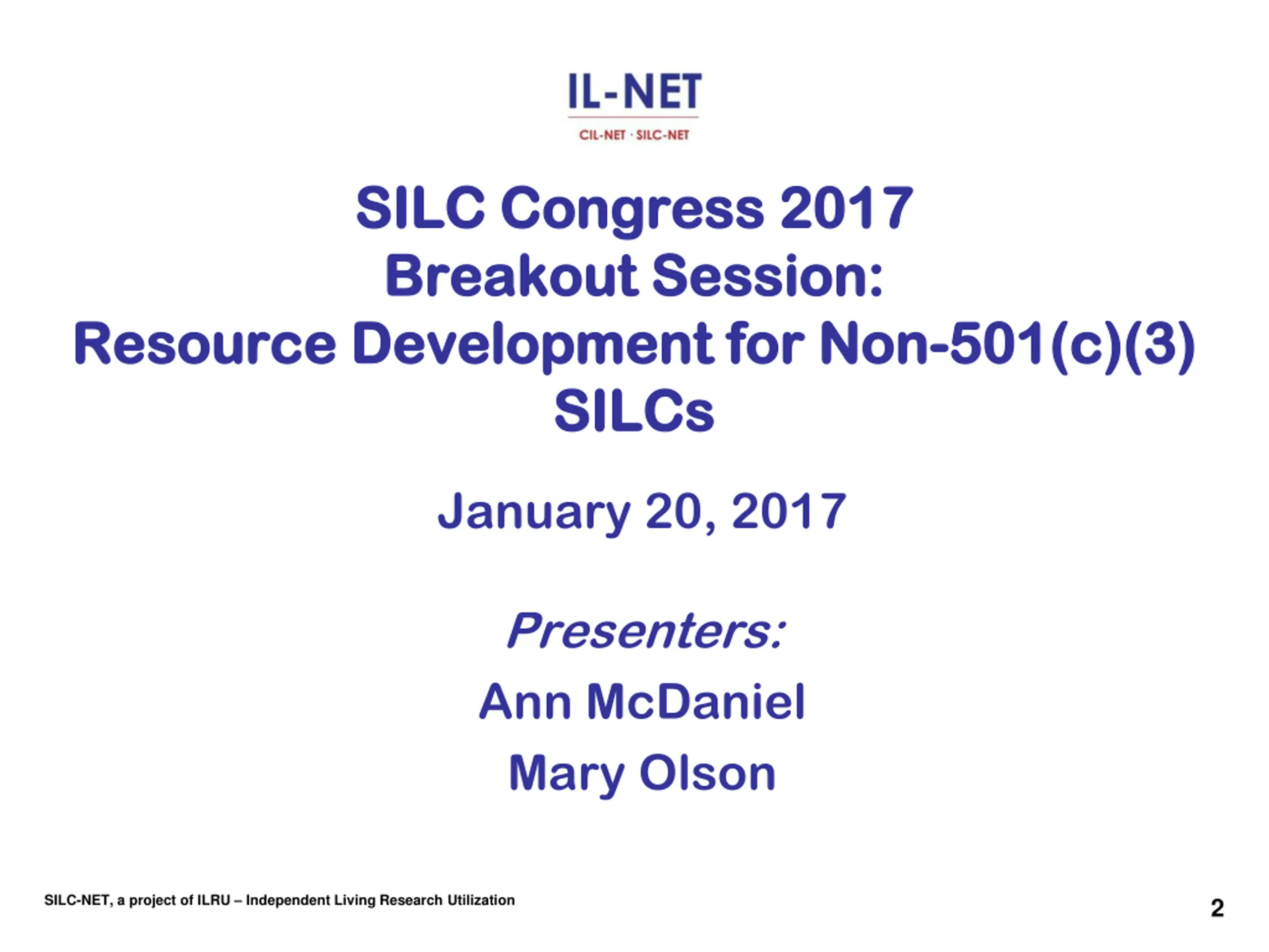 SILC Congress SILC Congress 2017 Breakout Session: Breakout Session: Resource Development for Non Development for Non- -501(c)(3) SILCs SILCs 2017 Resource 501(c)(3) January 20, 2017 Presenters: Ann McDaniel Mary Olson SILC-NET, a project of ILRU Independent Living Research Utilization 2