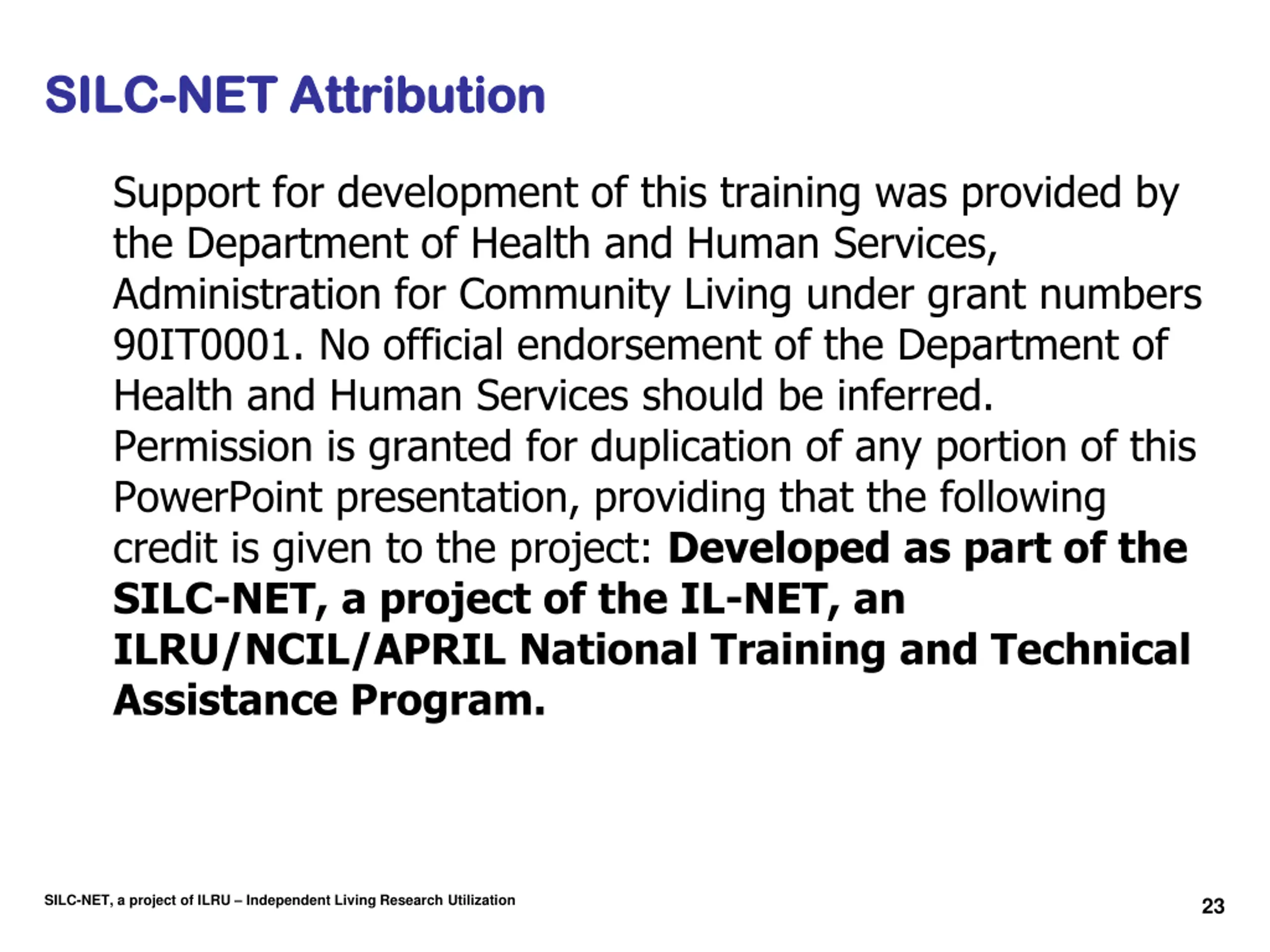 SILC SILC- -NET NET Attribution Attribution Support for development of this training was provided by the Department of Health and Human Services, Administration for Community Living under grant numbers 90IT0001. No official endorsement of the Department of Health and Human Services should be inferred. Permission is granted for duplication of any portion of this PowerPoint presentation, providing that the following credit is given to the project: Developed as part of the SILC-NET, a project of the IL-NET, an ILRU/NCIL/APRIL National Training and Technical Assistance Program. SILC-NET, a project of ILRU Independent Living Research Utilization 23