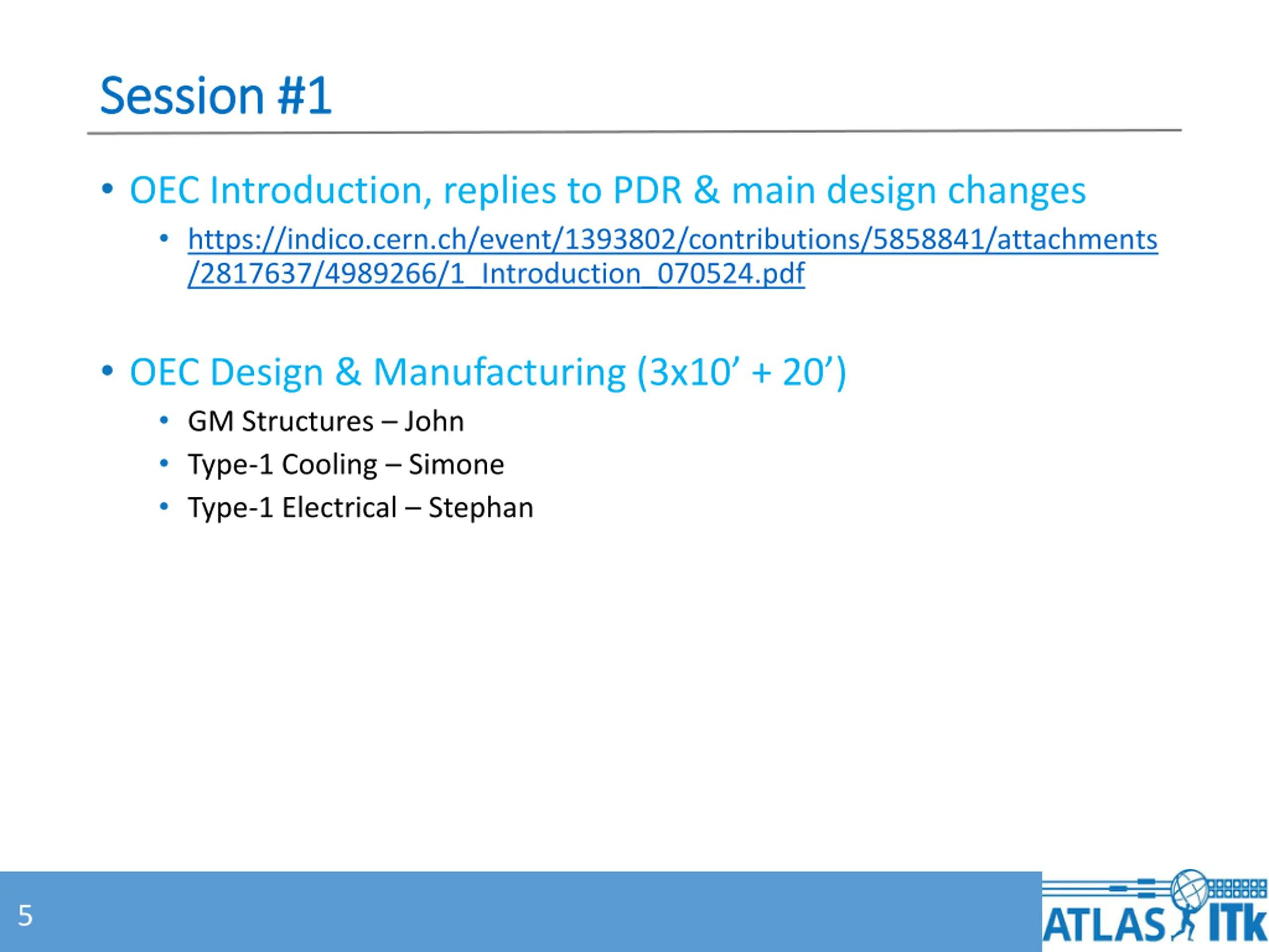 Session #1 Session #1 OEC Introduction, replies to PDR & main design changes https://indico.cern.ch/event/1393802/contributions/5858841/attachments /2817637/4989266/1_Introduction_070524.pdf OEC Design & Manufacturing (3x10 + 20 ) GM Structures John Type-1 Cooling Simone Type-1 Electrical Stephan 5