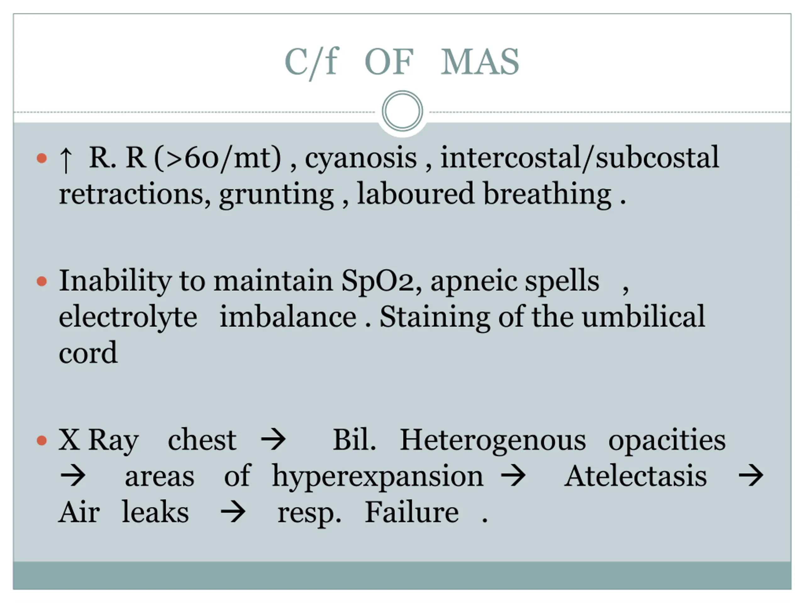 C/f OF MAS R. R (>60/mt) , cyanosis , intercostal/subcostal retractions, grunting , laboured breathing . Inability to maintain SpO2, apneic spells , electrolyte imbalance . Staining of the umbilical cord X Ray chest areas of hyperexpansion Air leaks resp. Failure . Bil. Heterogenous opacities Atelectasis