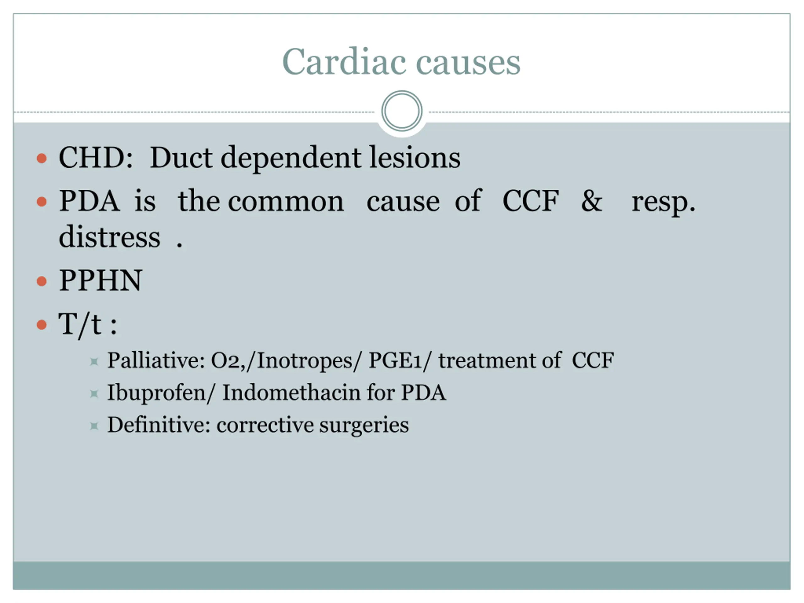 Cardiac causes CHD: Duct dependent lesions PDA is the common cause of CCF & resp. distress . PPHN T/t : Palliative: O2,/Inotropes/ PGE1/ treatment of CCF Ibuprofen/ Indomethacin for PDA Definitive: corrective surgeries