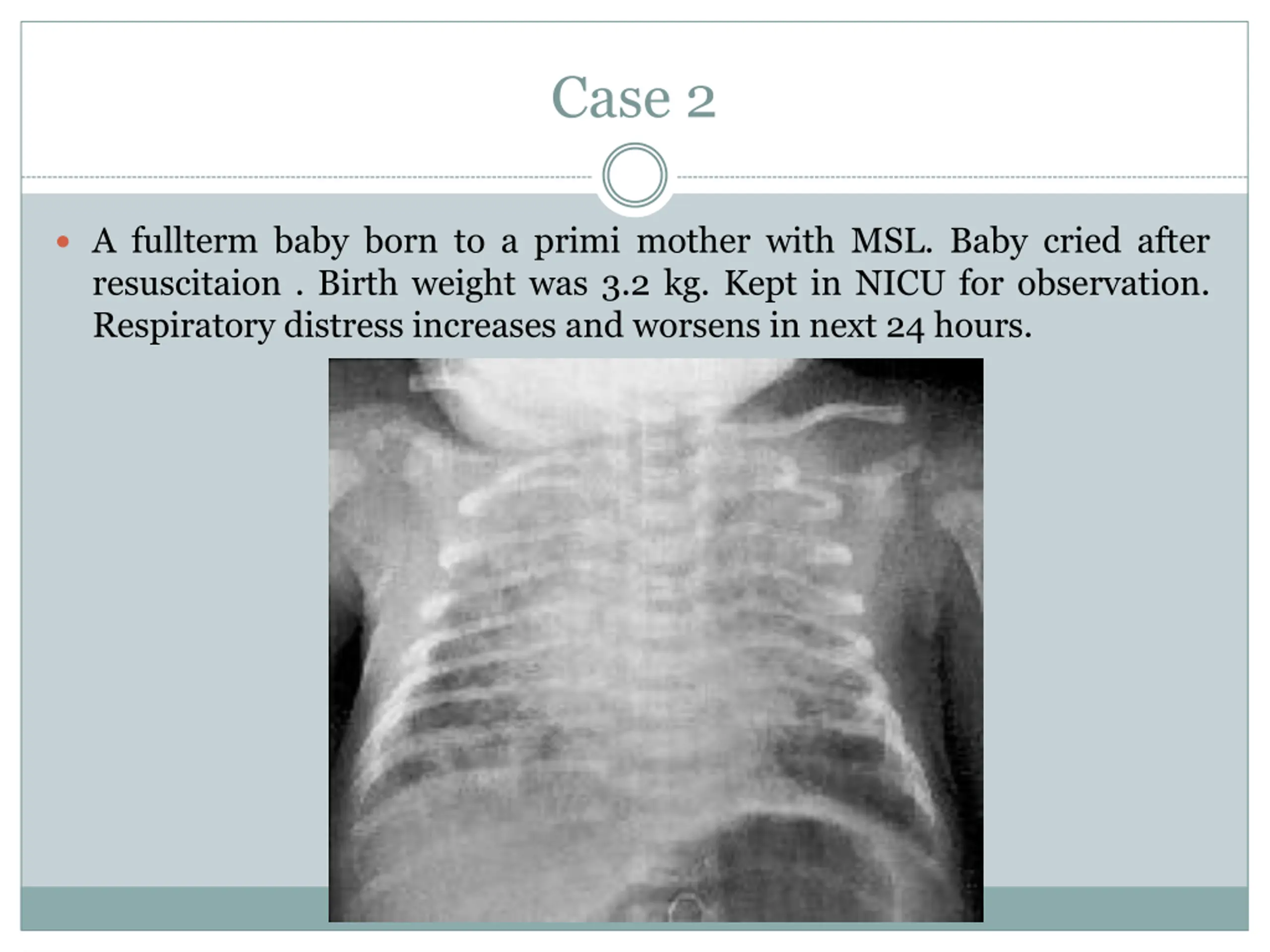 Case 2 A fullterm baby born to a primi mother with MSL. Baby cried after resuscitaion . Birth weight was 3.2 kg. Kept in NICU for observation. Respiratory distress increases and worsens in next 24 hours.