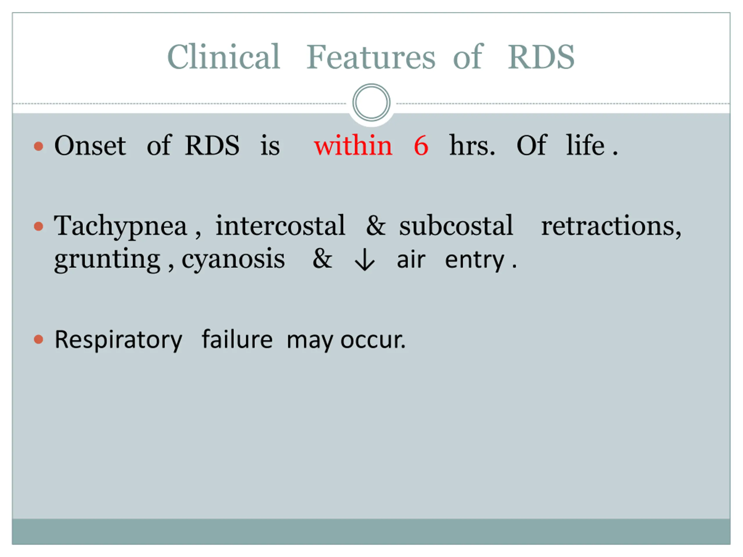 Clinical Features of RDS Onset of RDS is within 6 hrs. Of life . Tachypnea , intercostal & subcostal retractions, grunting , cyanosis & air entry . Respiratory failure may occur.