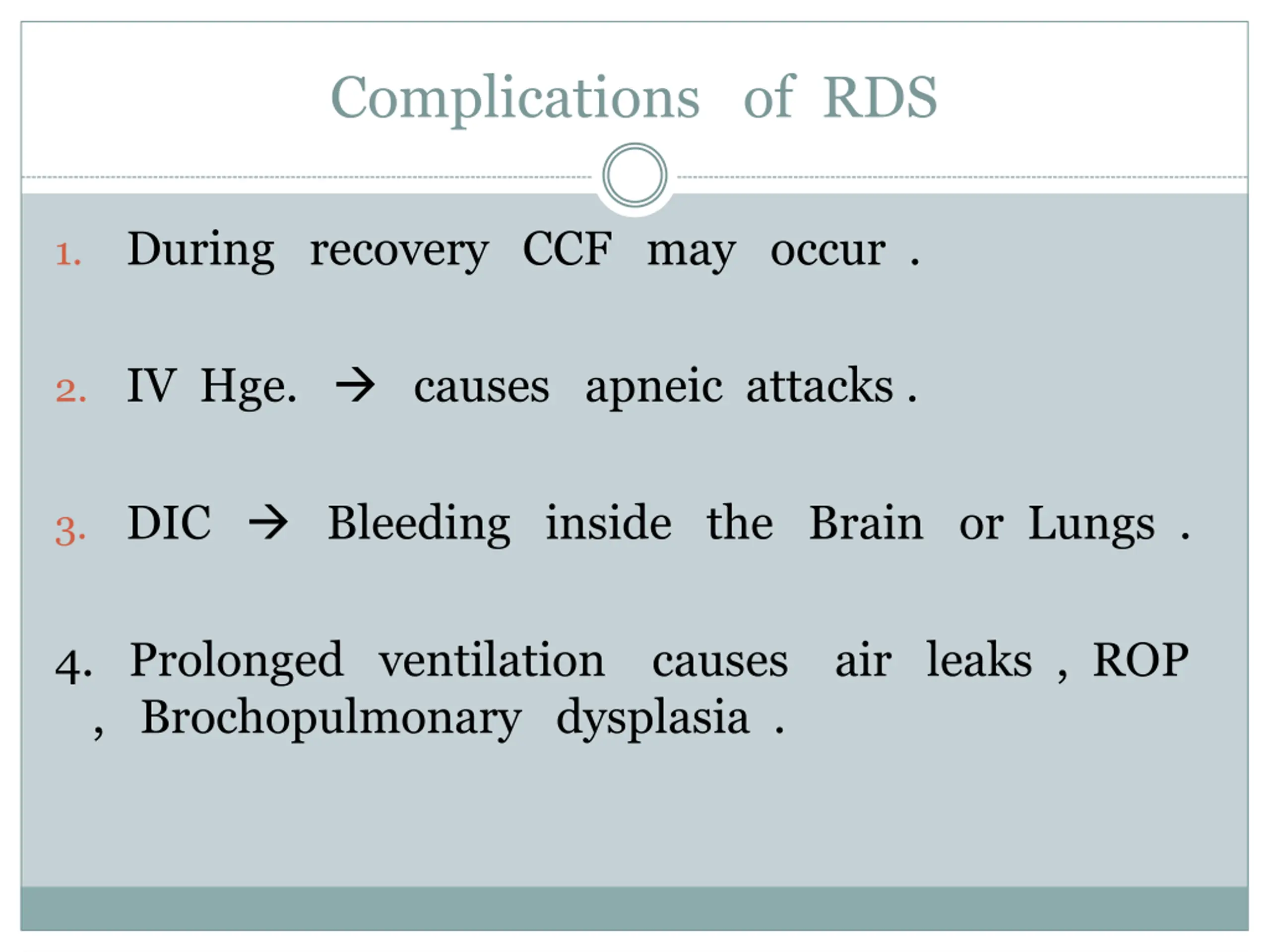 Complications of RDS During recovery CCF may occur . 1. 2. IV Hge. causes apneic attacks . 3. DIC Bleeding inside the Brain or Lungs . 4. Prolonged ventilation causes air leaks , ROP , Brochopulmonary dysplasia .