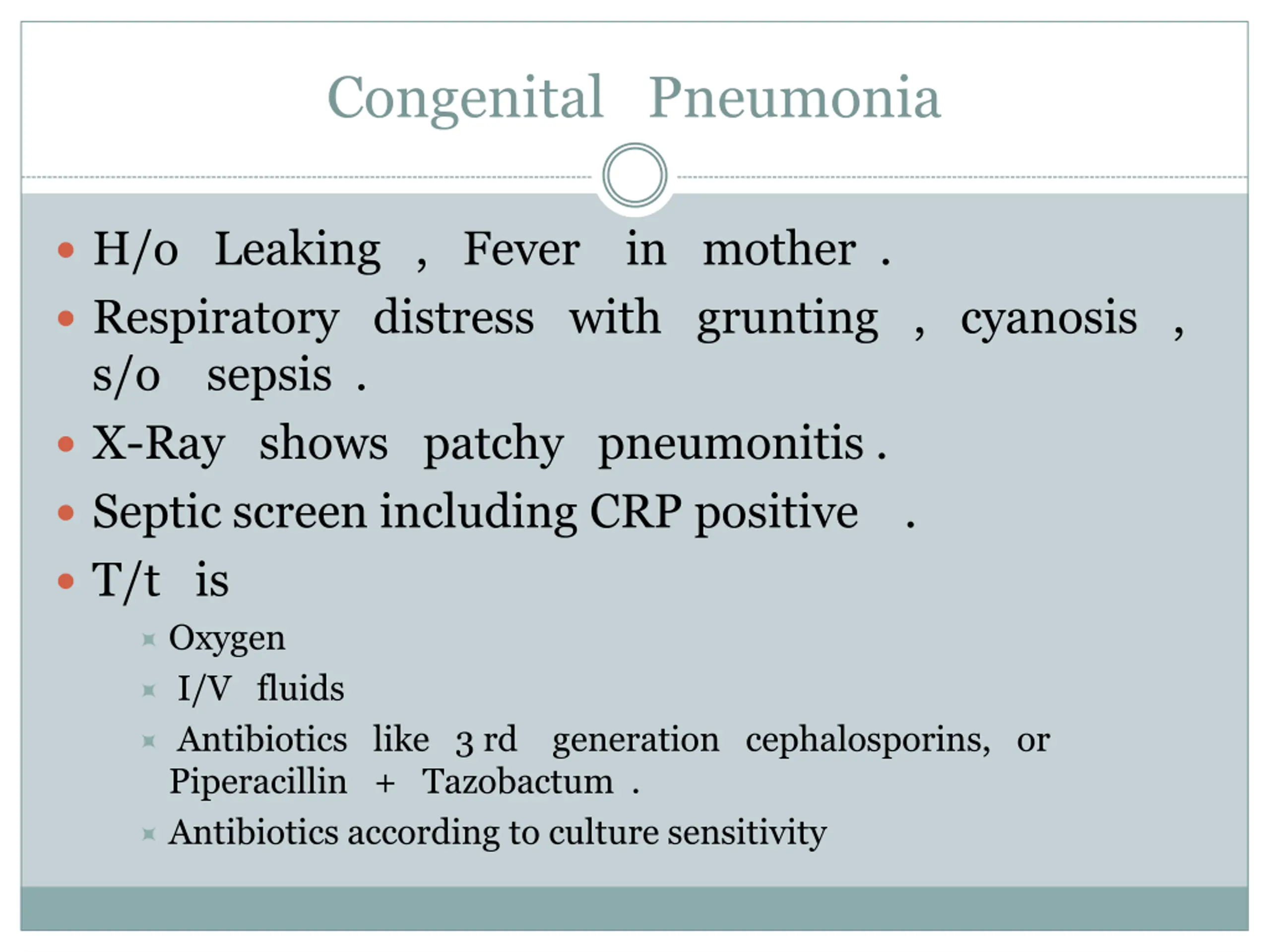 Congenital Pneumonia H/o Leaking , Fever in mother . Respiratory distress with grunting , cyanosis , s/o sepsis . X-Ray shows patchy pneumonitis . Septic screen including CRP positive . T/t is Oxygen I/V fluids Antibiotics like 3 rd generation cephalosporins, or Piperacillin + Tazobactum . Antibiotics according to culture sensitivity