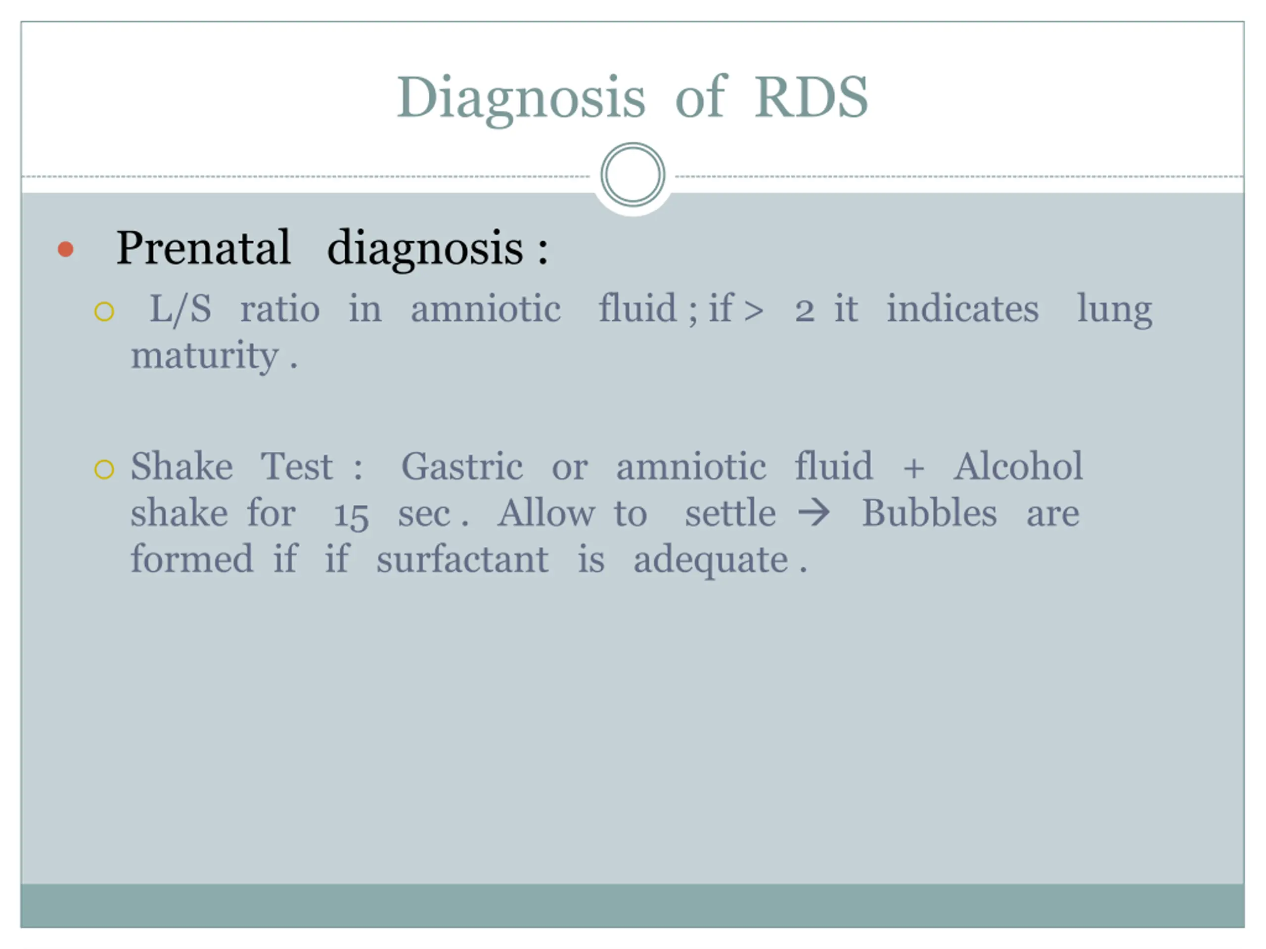 Diagnosis of RDS Prenatal diagnosis : L/S ratio in amniotic fluid ; if > 2 it indicates lung maturity . Shake Test : Gastric or amniotic fluid + Alcohol shake for 15 sec . Allow to settle Bubbles are formed if if surfactant is adequate .