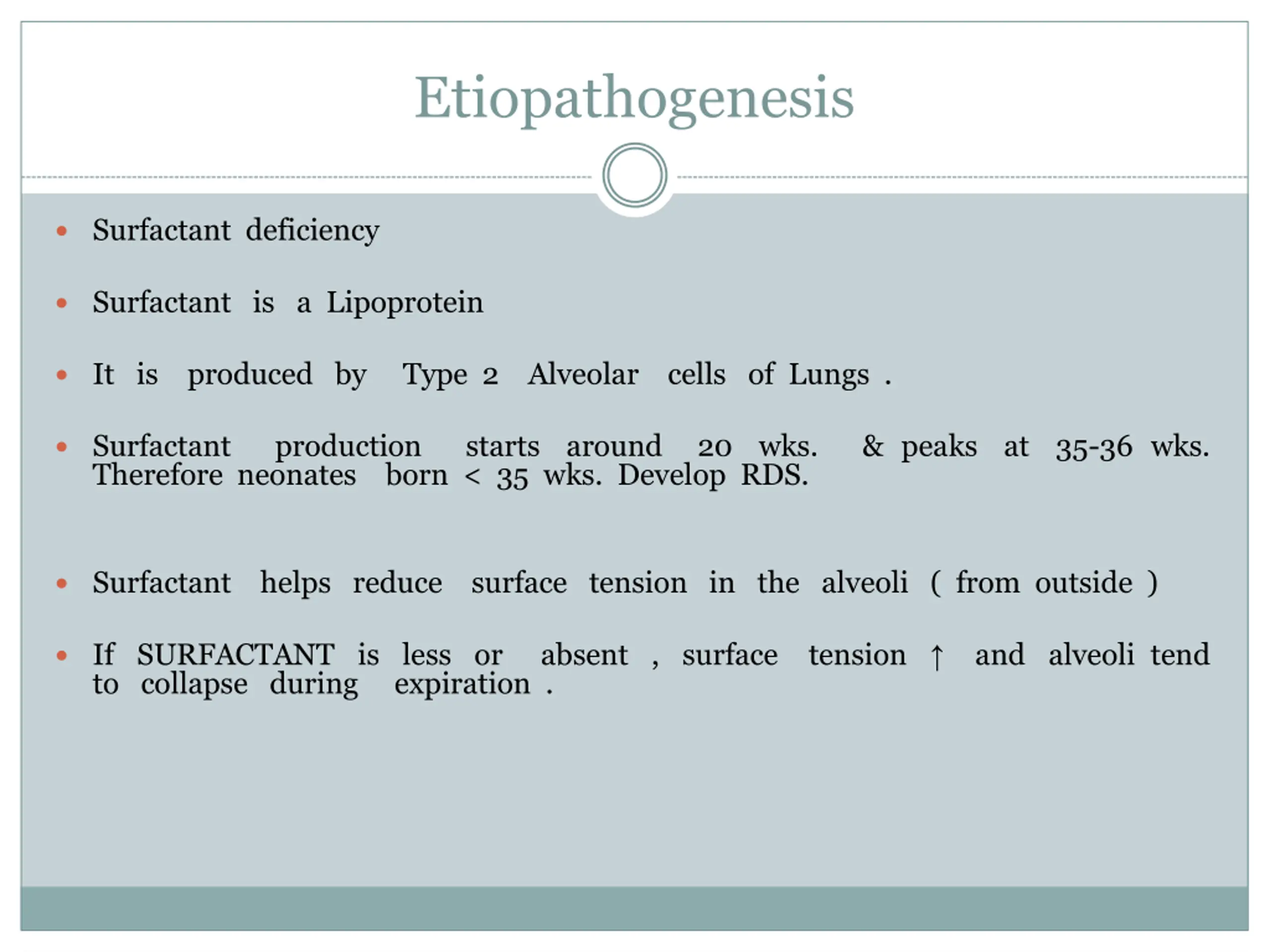 Etiopathogenesis Surfactant deficiency Surfactant is a Lipoprotein It is produced by Type 2 Alveolar cells of Lungs . Surfactant Therefore neonates production starts around born < 35 wks. Develop RDS. 20 wks. & peaks at 35-36 wks. Surfactant helps reduce surface tension in the alveoli ( from outside ) If SURFACTANT is less or to collapse during absent , surface tension and alveoli tend expiration .