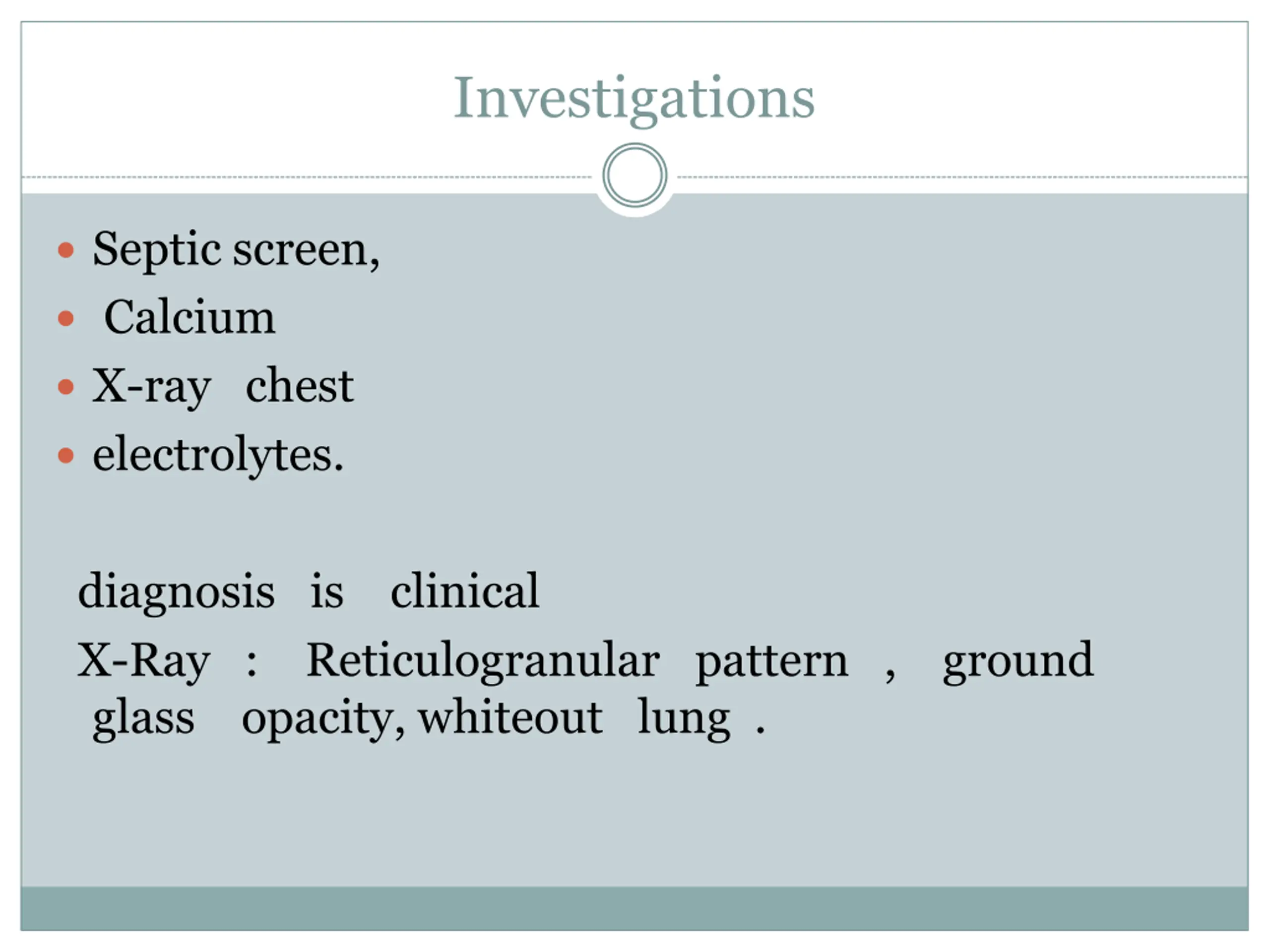Investigations Septic screen, Calcium X-ray chest electrolytes. diagnosis is clinical X-Ray : Reticulogranular pattern , ground glass opacity, whiteout lung .
