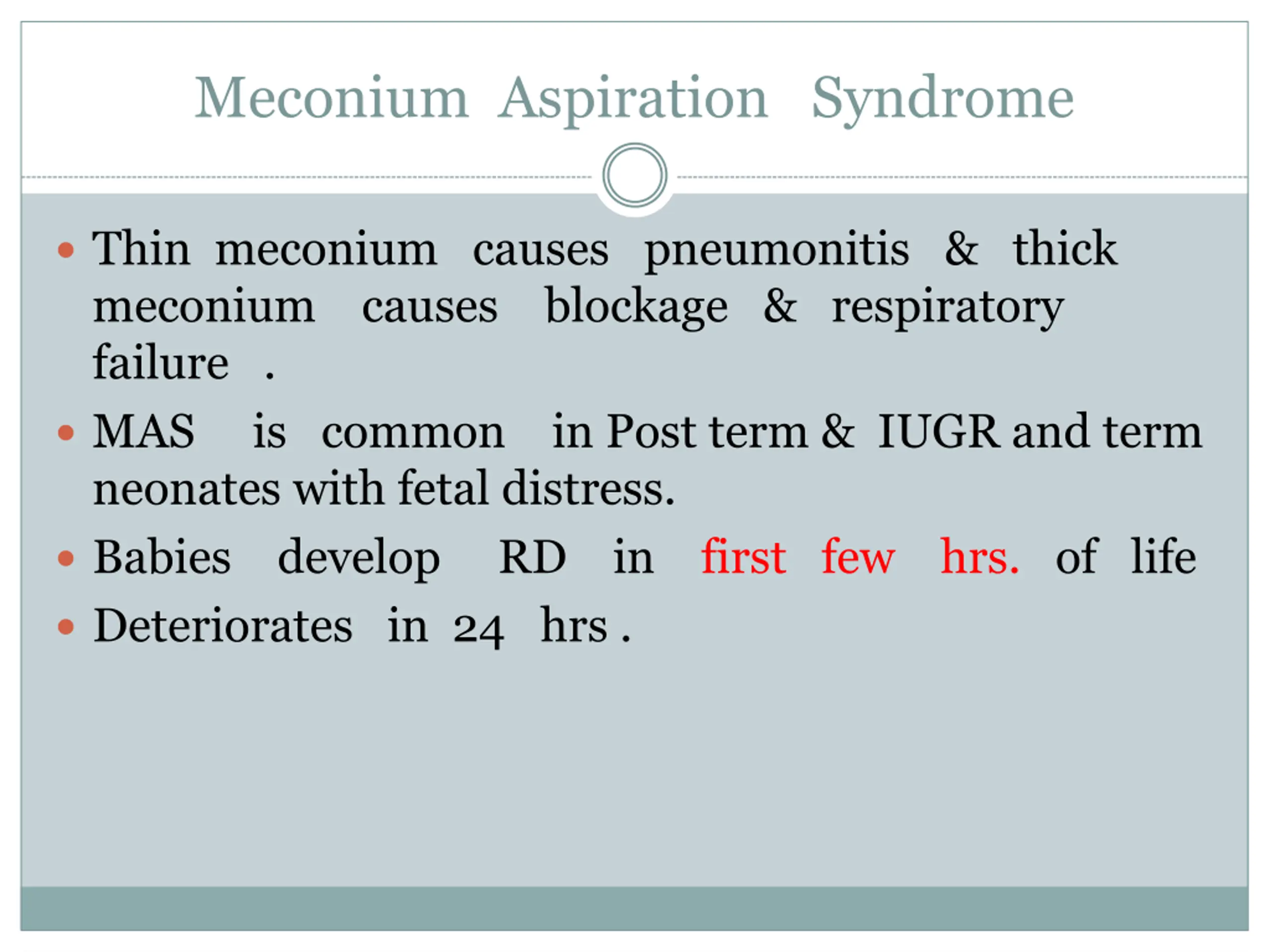 Meconium Aspiration Syndrome Thin meconium causes pneumonitis & thick meconium causes blockage & respiratory failure . MAS is common in Post term & IUGR and term neonates with fetal distress. Babies develop RD in first few hrs. of life Deteriorates in 24 hrs .