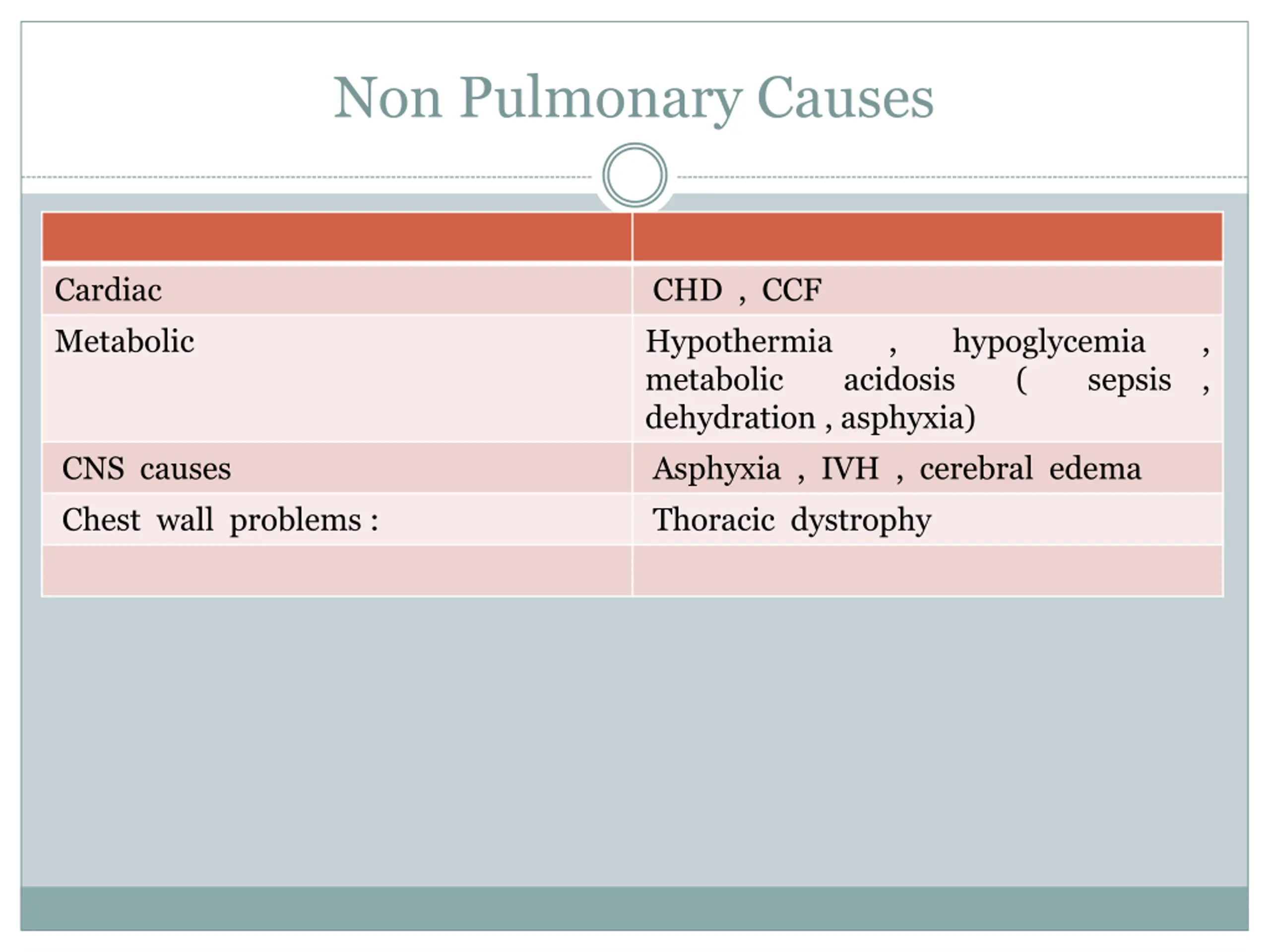Non Pulmonary Causes Cardiac Metabolic CHD , CCF Hypothermia metabolic dehydration , asphyxia) Asphyxia , IVH , cerebral edema Thoracic dystrophy , hypoglycemia ( , , acidosis sepsis CNS causes Chest wall problems :