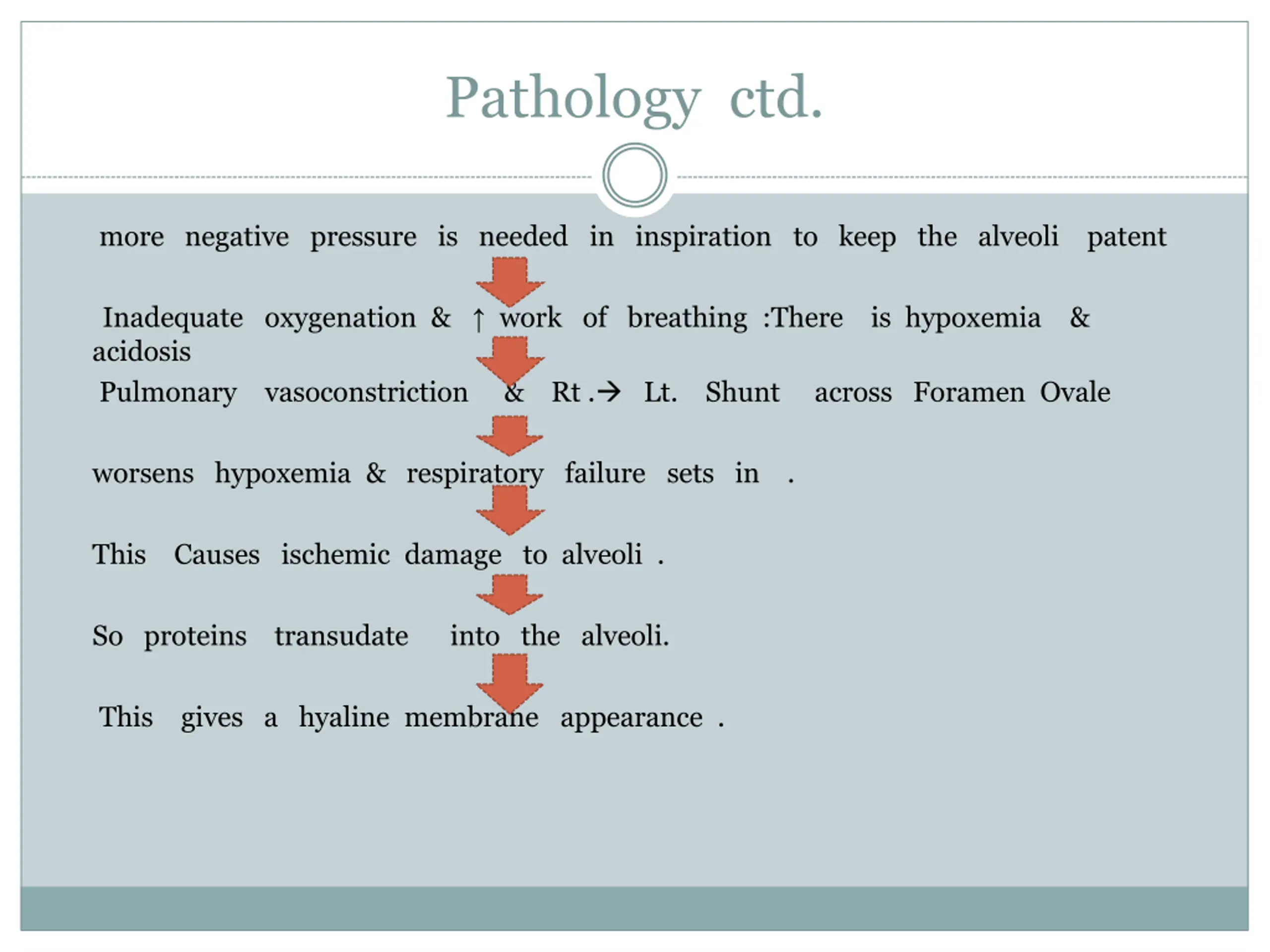 Pathology ctd. more negative pressure is needed in inspiration to keep the alveoli patent Inadequate oxygenation & work of breathing :There is hypoxemia & acidosis Pulmonary vasoconstriction & Rt . Lt. Shunt across Foramen Ovale worsens hypoxemia & respiratory failure sets in . This Causes ischemic damage to alveoli . So proteins transudate into the alveoli. This gives a hyaline membrane appearance .
